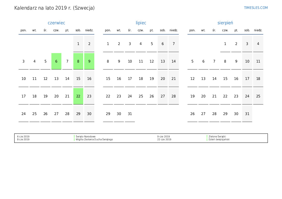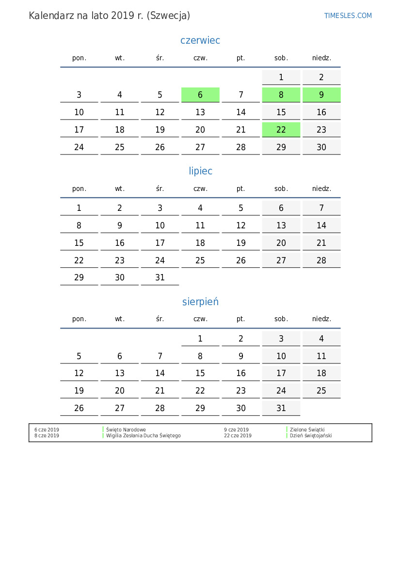 Pobierz i wydrukuj kalendarz PDF ze świętami i weekendami na lato 2019 roku dla Szwecji