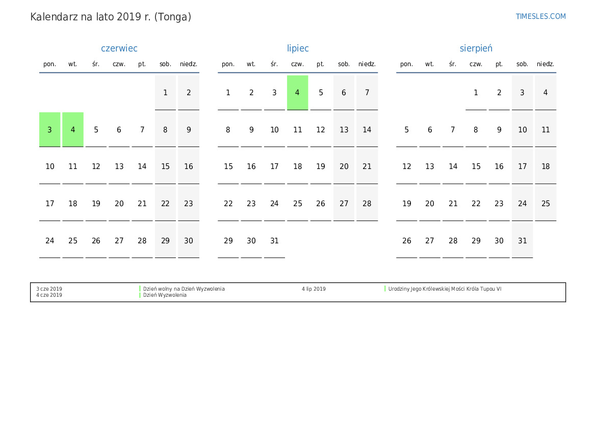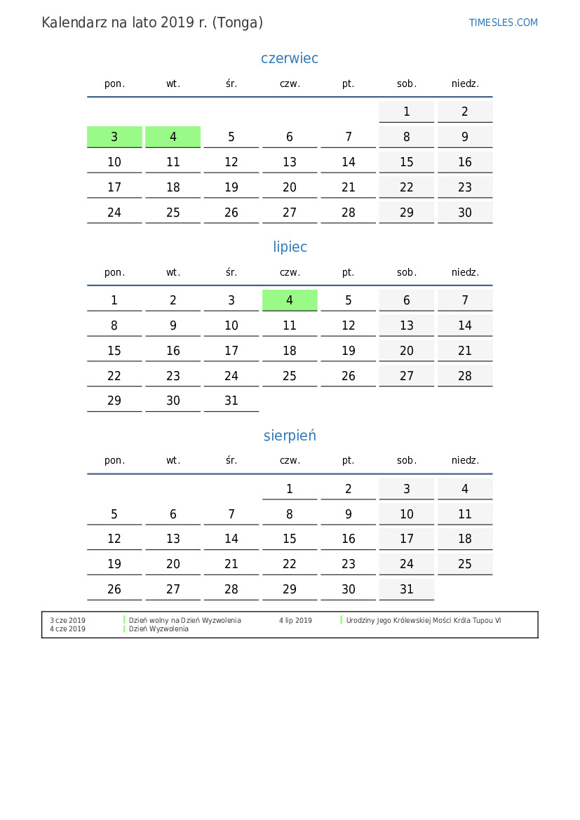 Pobierz i wydrukuj kalendarz PDF ze świętami i weekendami na lato 2019 roku dla Tonga