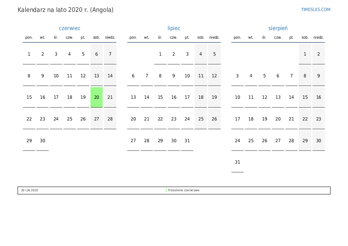 Pobierz i wydrukuj kalendarz PDF ze świętami i weekendami na lato 2020 roku dla Angoli