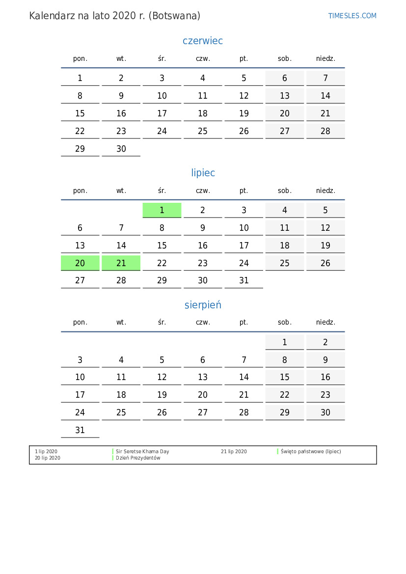 Pobierz i wydrukuj kalendarz PDF ze świętami i weekendami na lato 2020 roku dla Botswany