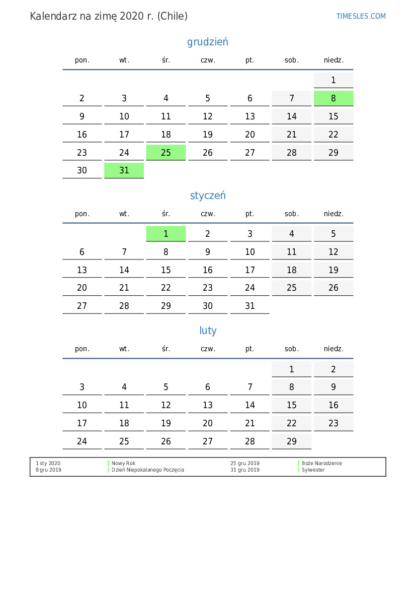 Kalendarz świąt i weekendów na lato 2020 roku dla Chile