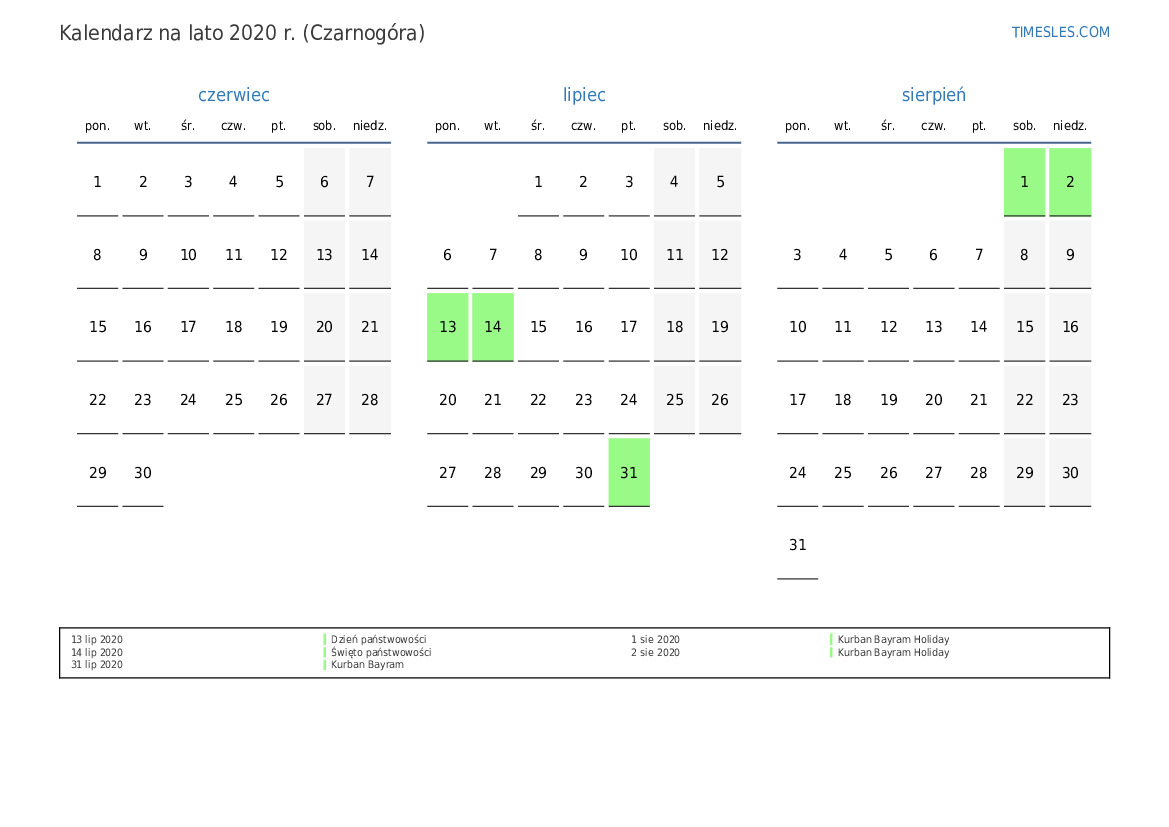 Pobierz i wydrukuj kalendarz PDF ze świętami i weekendami na lato 2020 roku dla Czarnogóry