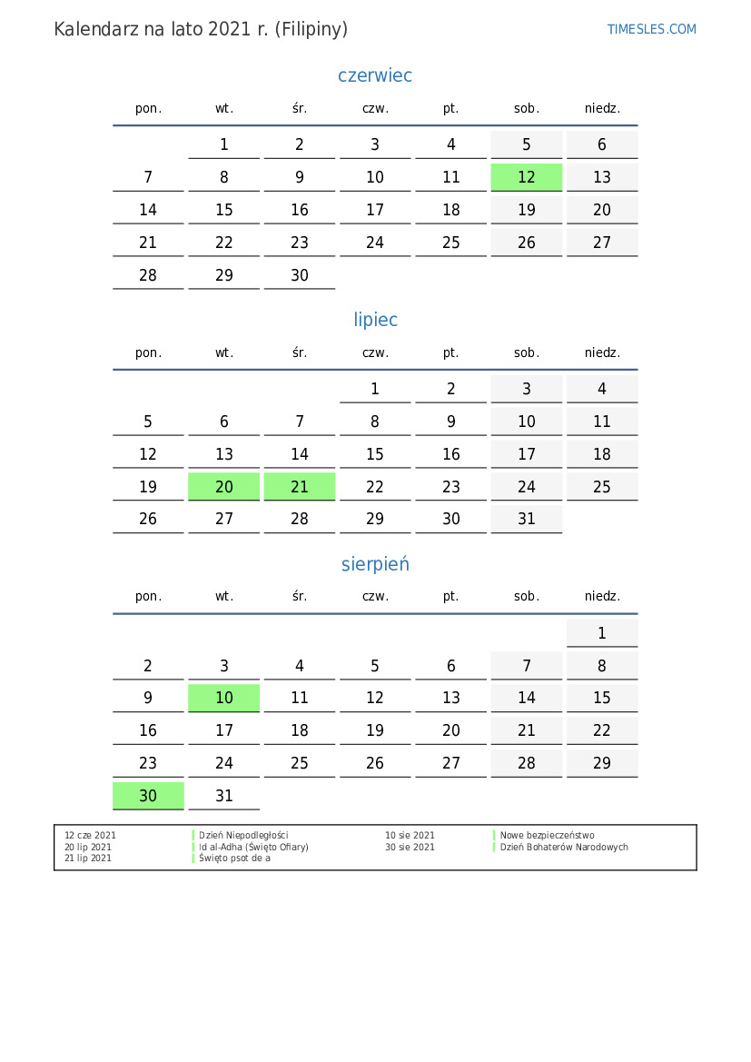 Kalendarz na lato 2021 r. dla Filipin