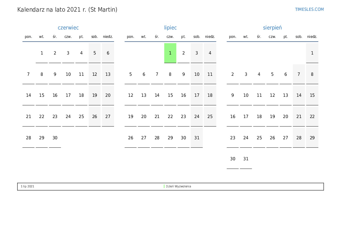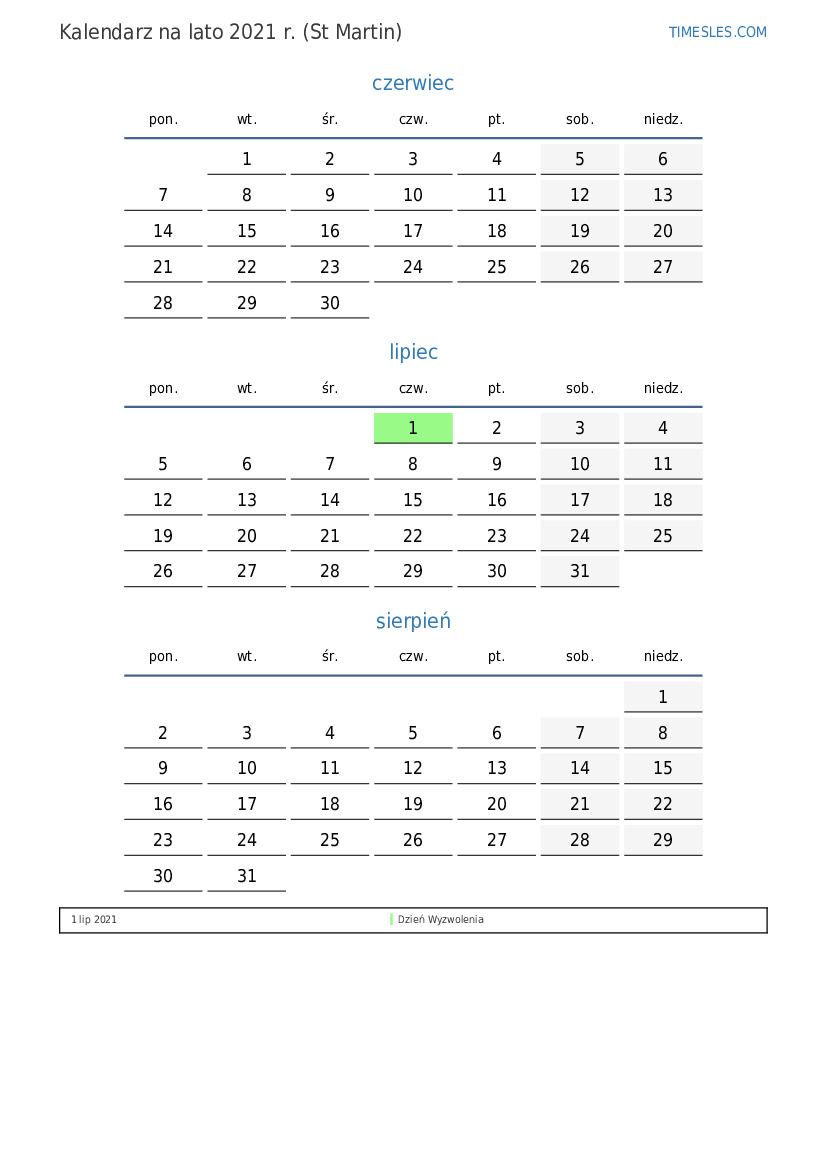 Pobierz i wydrukuj kalendarz PDF ze świętami i weekendami na lato 2021 roku dla Sint Maarten