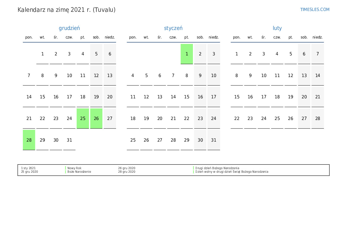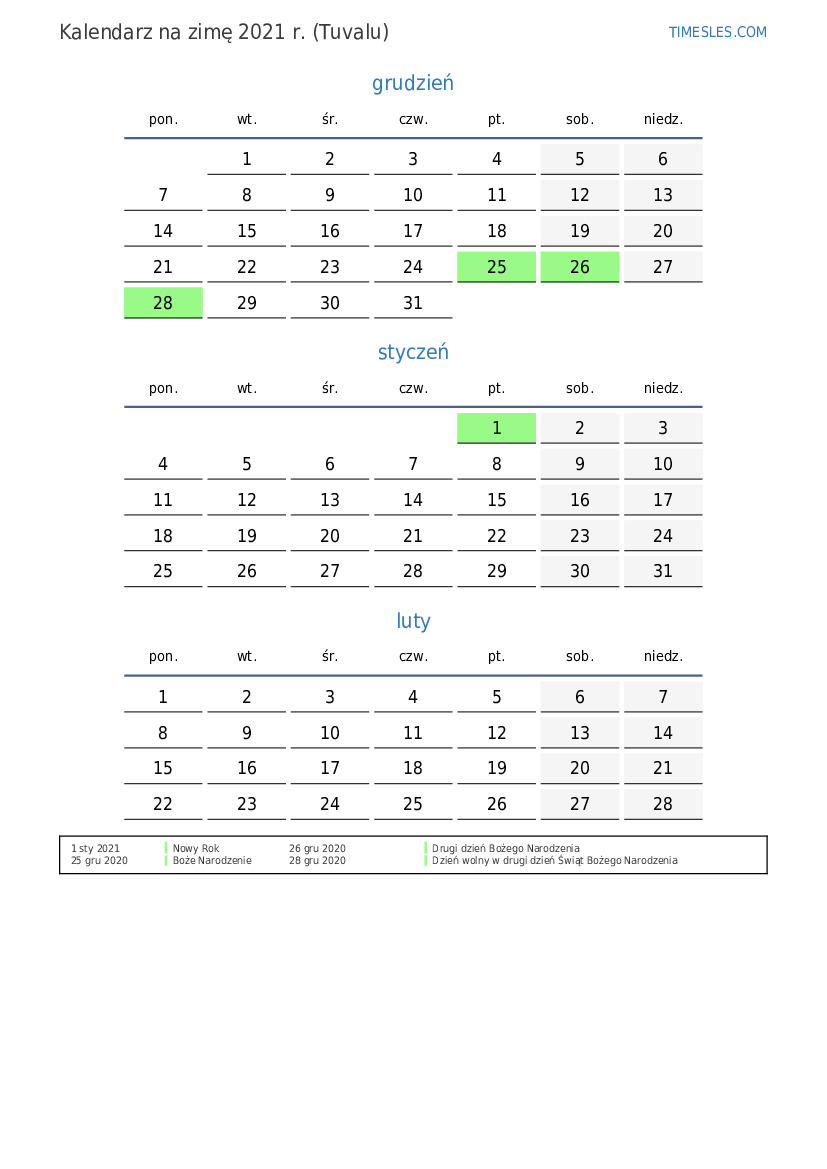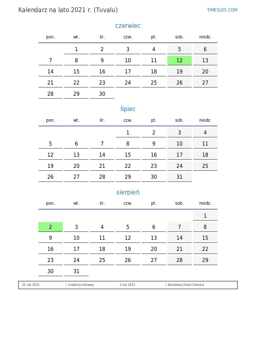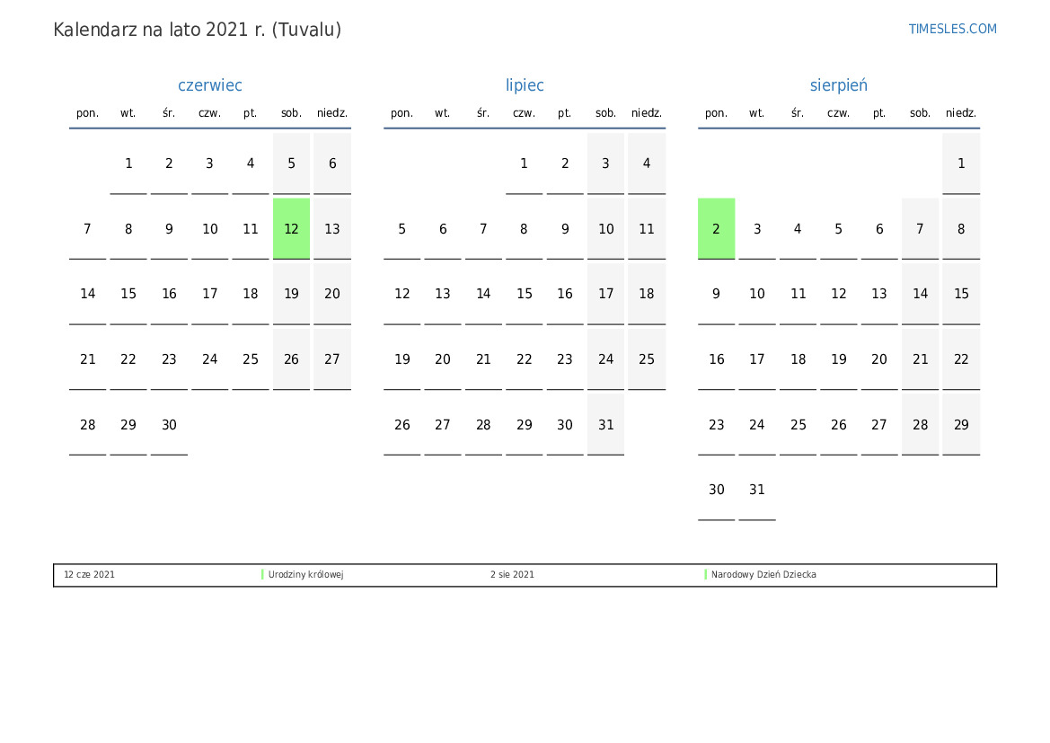 Kalendarz na lato 2021 r. dla Tuvalu