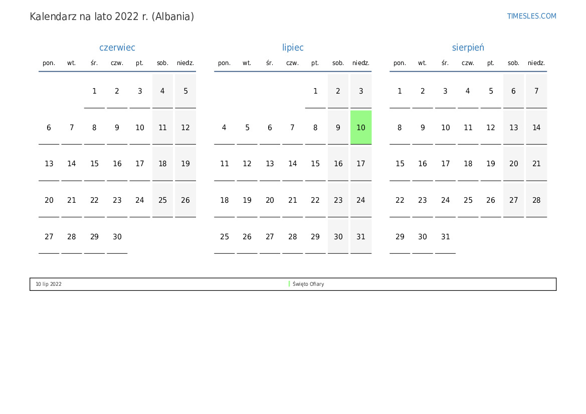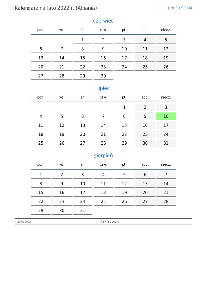 Kalendarz na lato 2022 r. dla Albanii