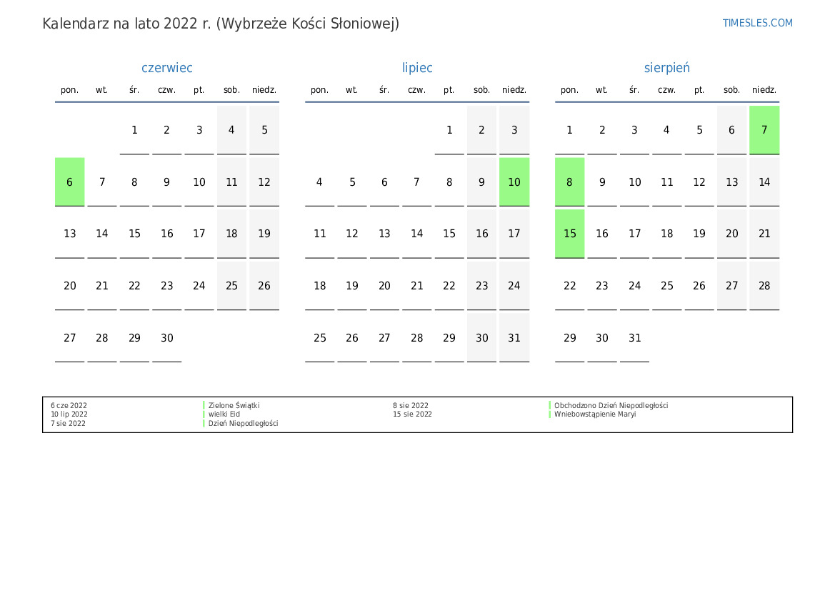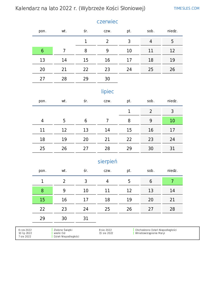 Pobierz i wydrukuj kalendarz PDF ze świętami i weekendami na lato 2022 roku dla Wybrzeża Kości Słoniowej