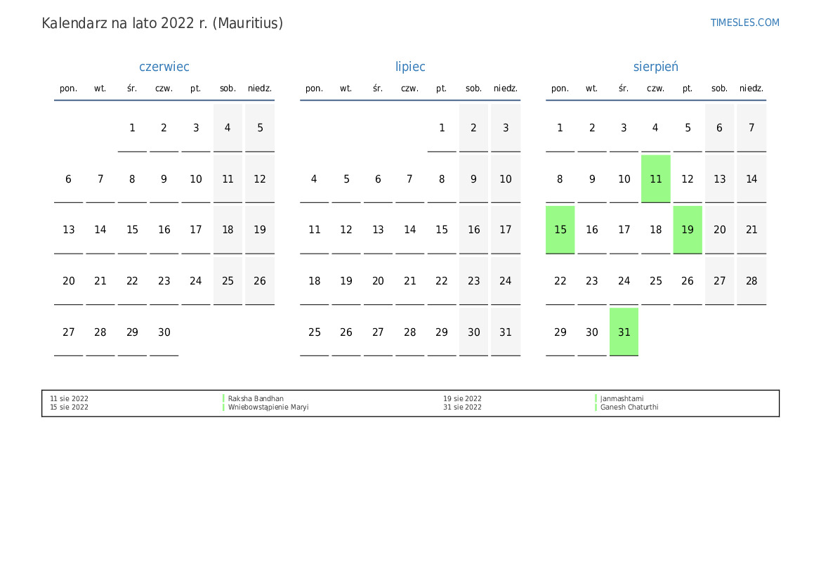 Kalendarz na lato 2022 r. dla Mauritiusa