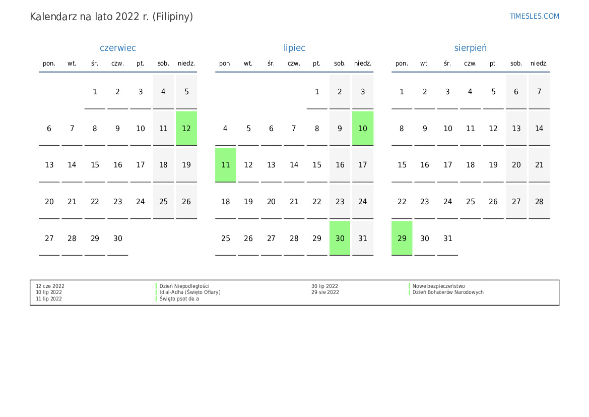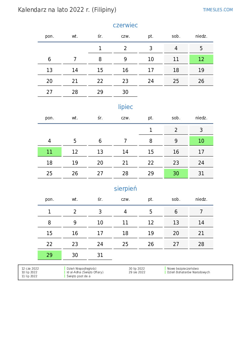 Pobierz i wydrukuj kalendarz PDF ze świętami i weekendami na lato 2022 roku dla Filipin
