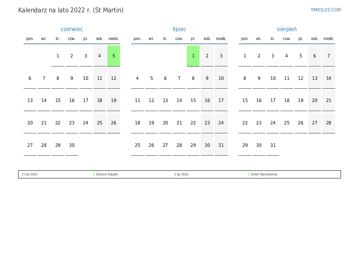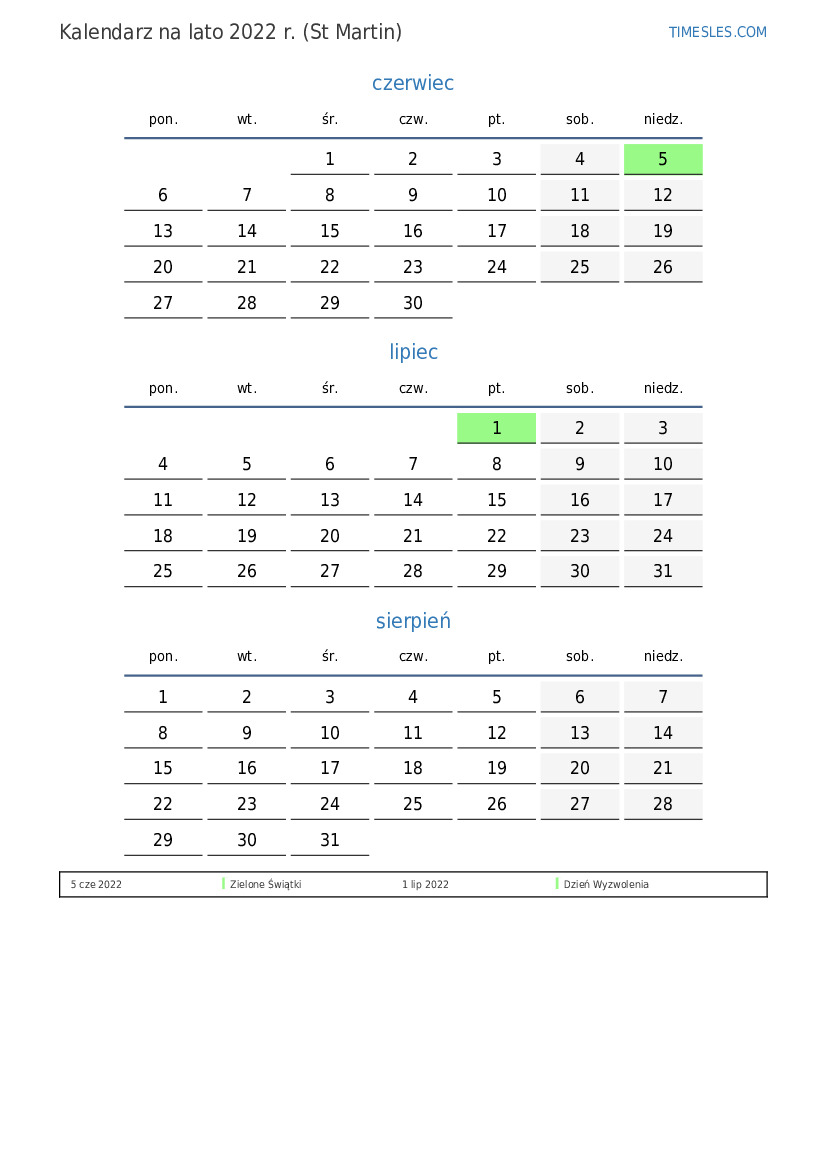 Pobierz i wydrukuj kalendarz PDF ze świętami i weekendami na lato 2022 roku dla Sint Maarten