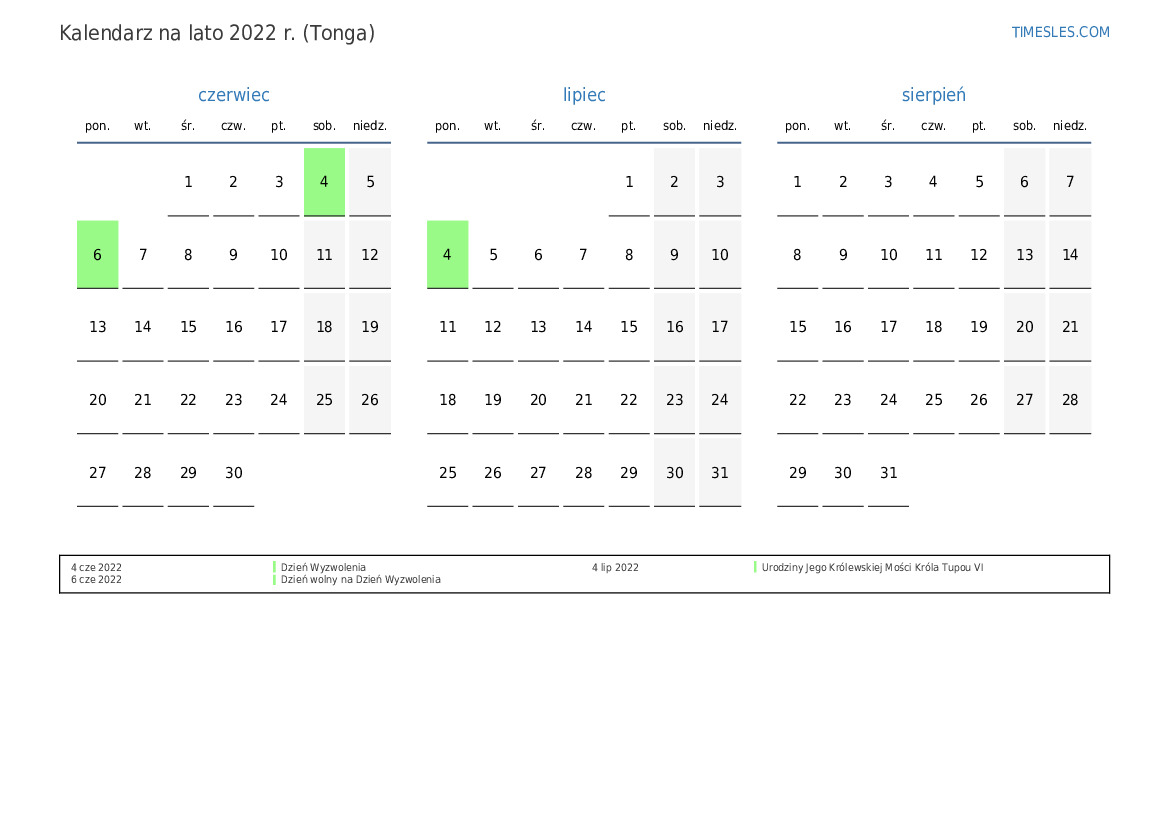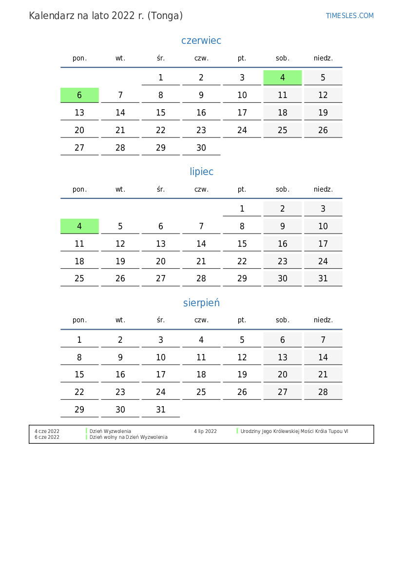 Pobierz i wydrukuj kalendarz PDF ze świętami i weekendami na lato 2022 roku dla Tonga