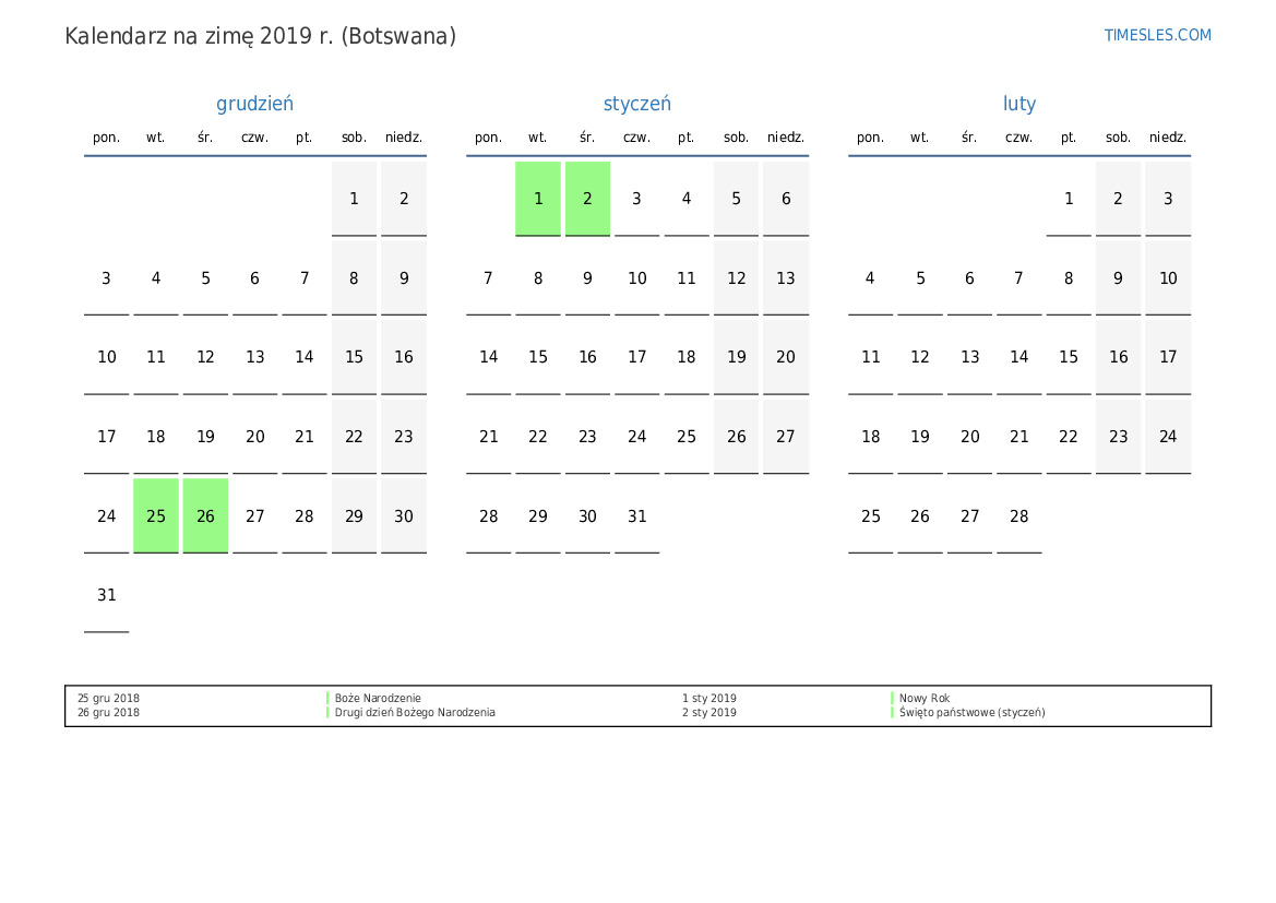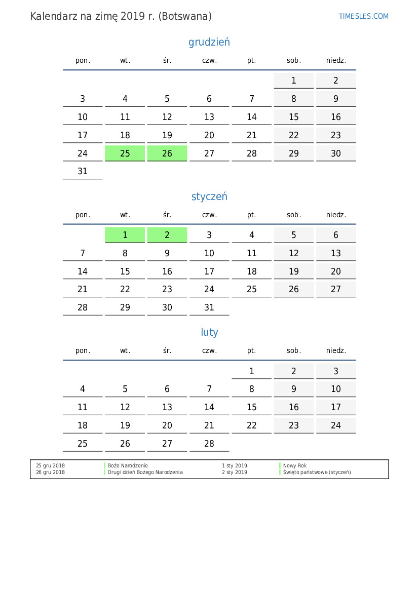 Pobierz i wydrukuj kalendarz PDF ze świętami i weekendami na zimę 2019 roku dla Botswany