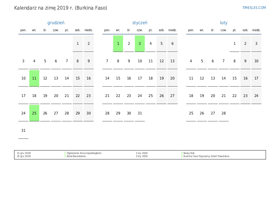 Kalendarz na zimę 2019 r. dla Burkina Faso