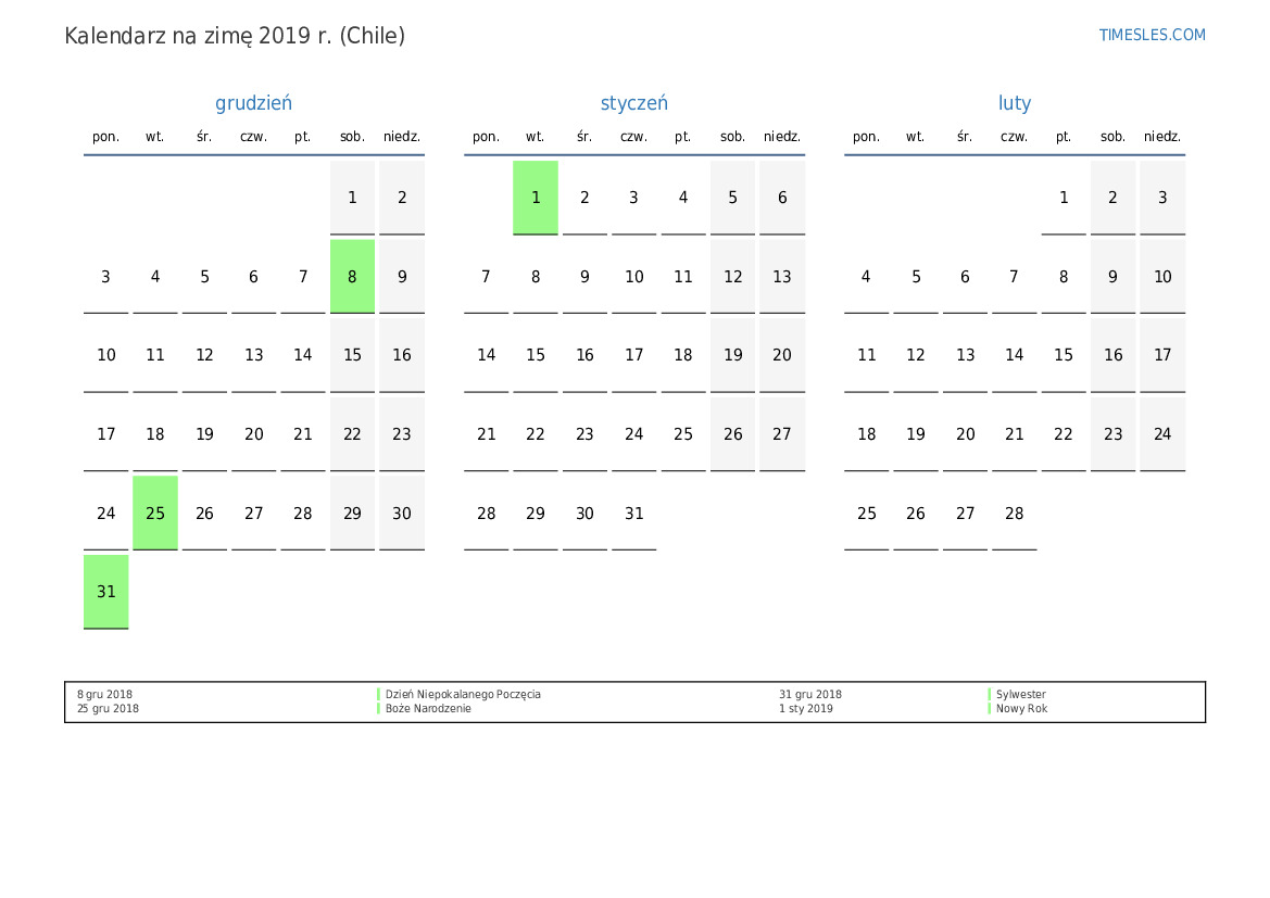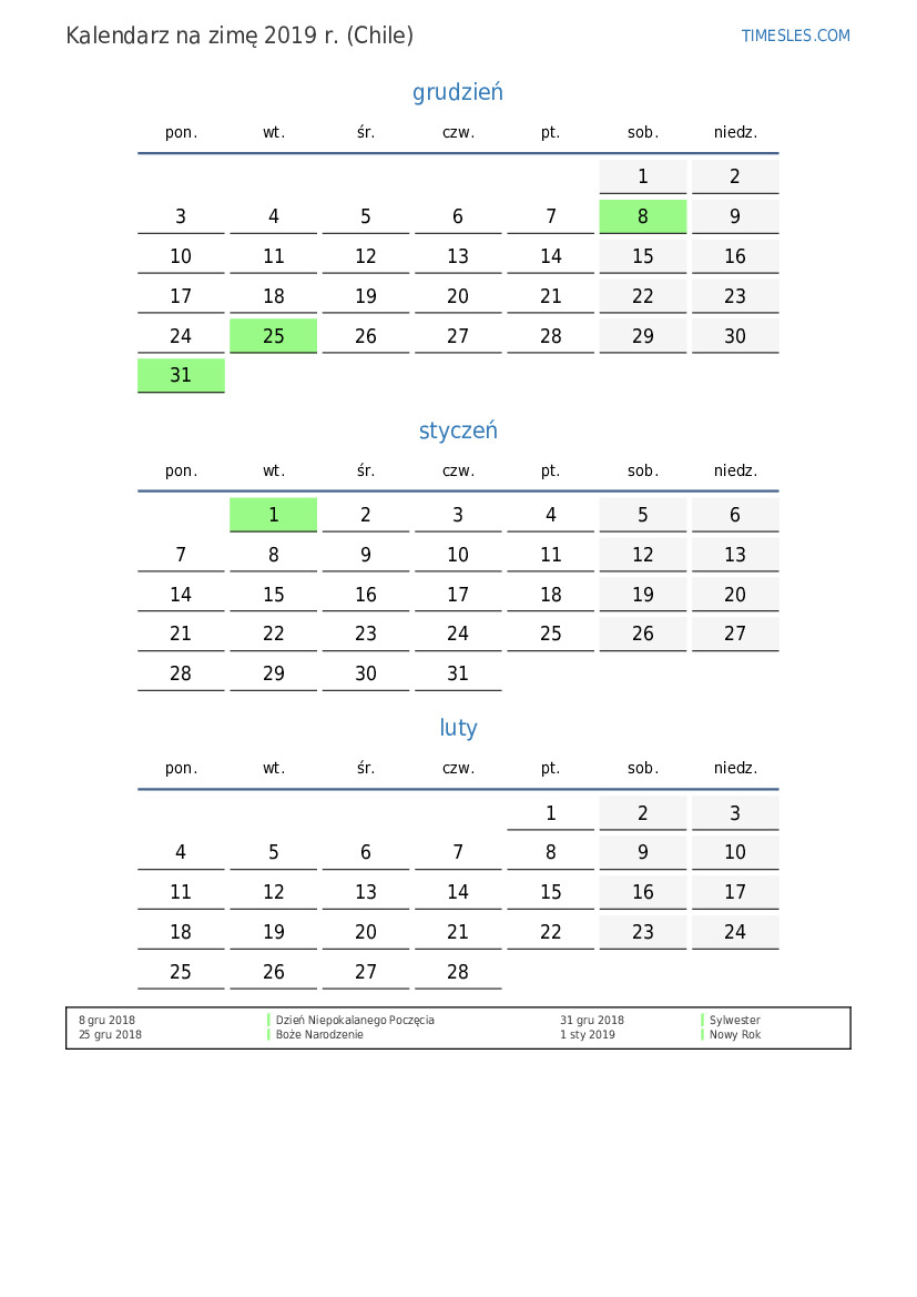 Pobierz i wydrukuj kalendarz PDF ze świętami i weekendami na zimę 2019 roku dla Chile