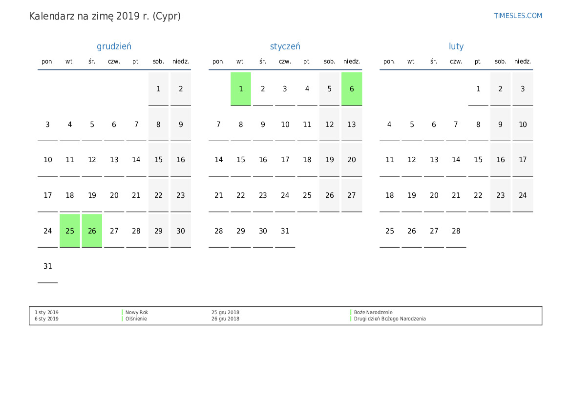 Pobierz i wydrukuj kalendarz PDF ze świętami i weekendami na zimę 2019 roku dla Cypru