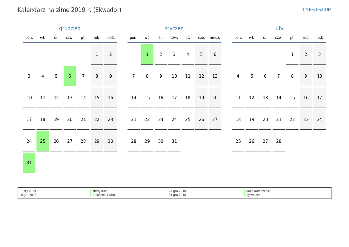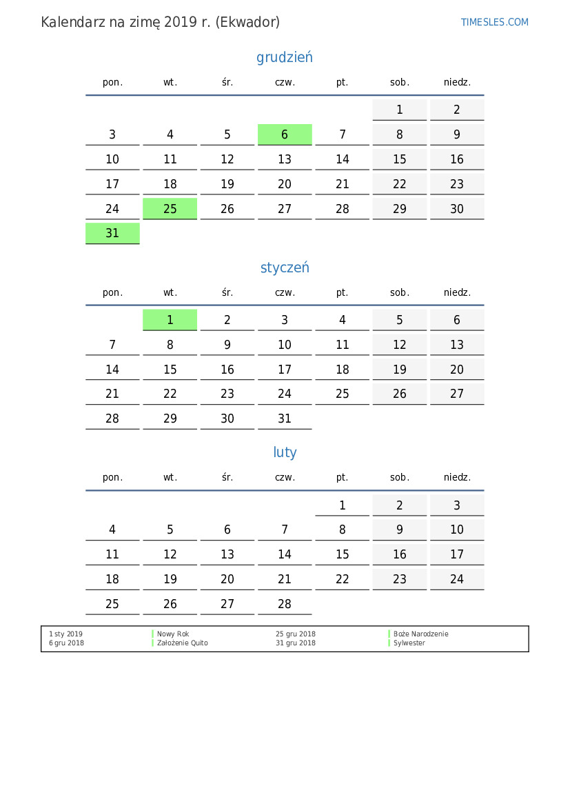Kalendarz na zimę 2019 r. dla Ekwadoru