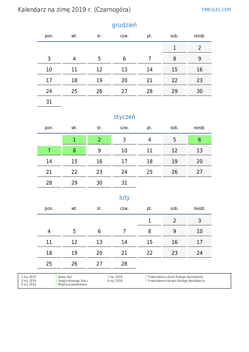 Pobierz i wydrukuj kalendarz PDF ze świętami i weekendami na zimę 2019 roku dla Czarnogóry