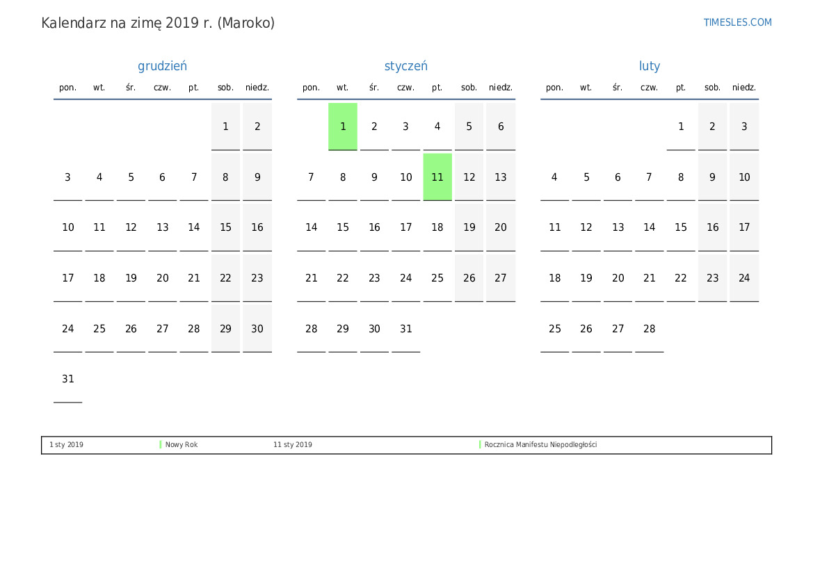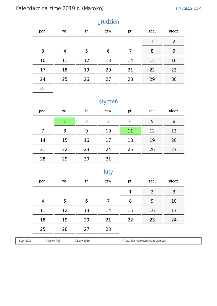 Pobierz i wydrukuj kalendarz PDF ze świętami i weekendami na zimę 2019 roku dla Maroka