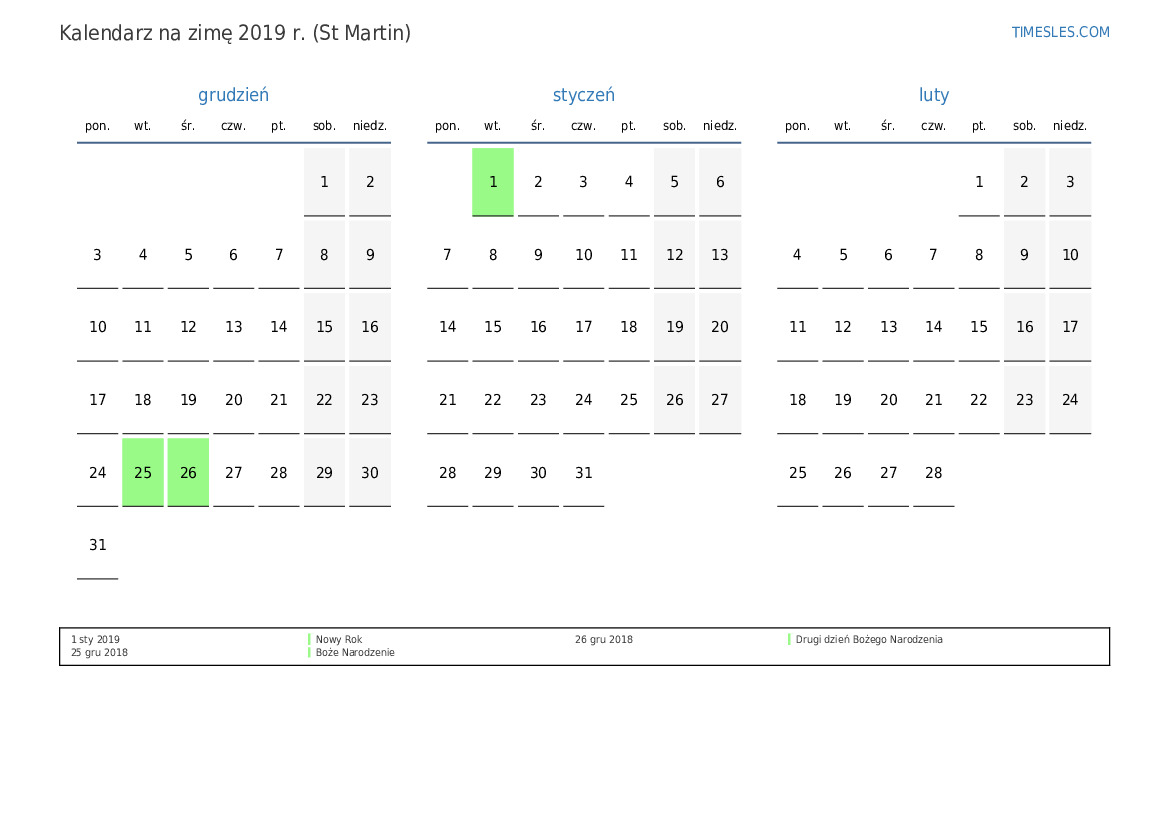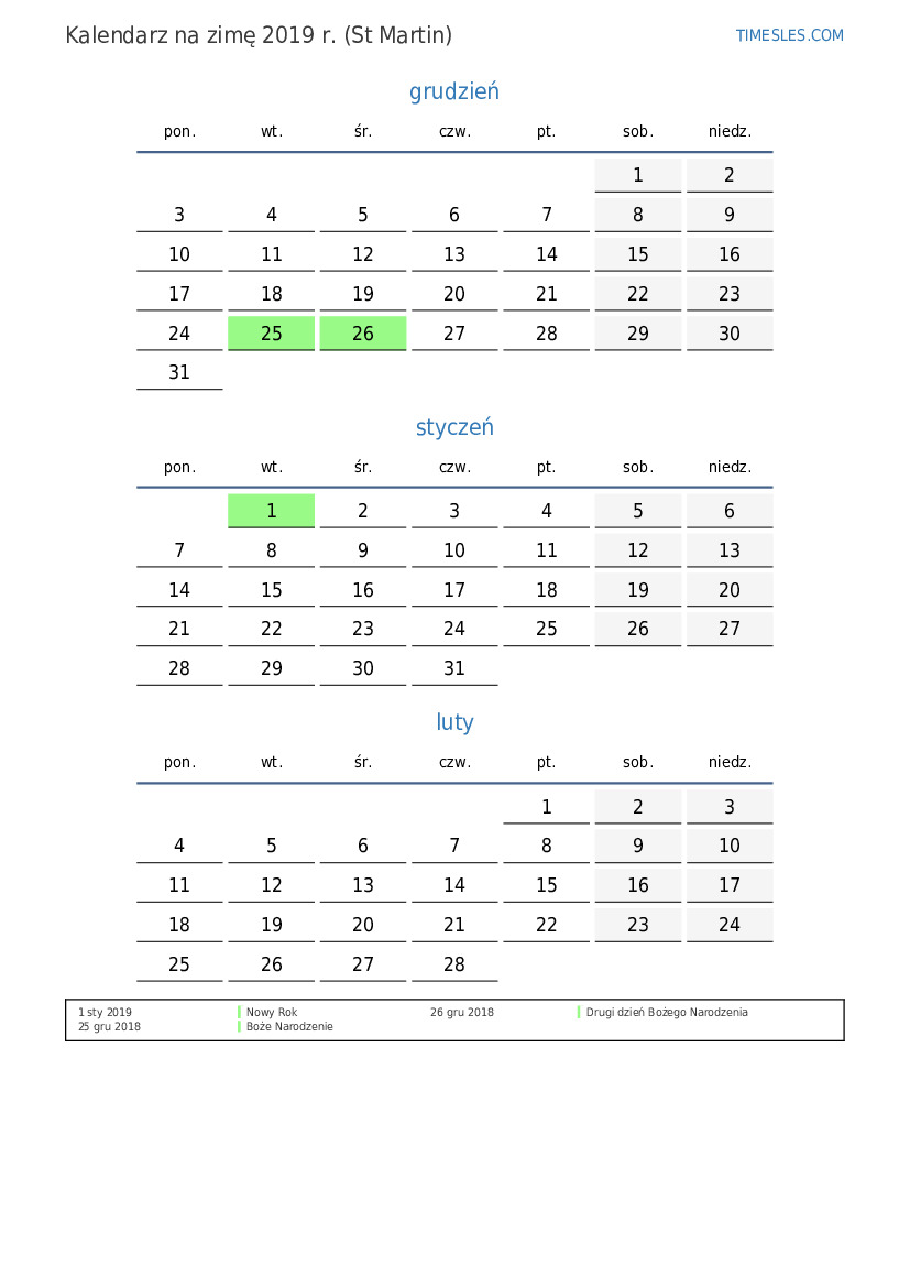 Pobierz i wydrukuj kalendarz PDF ze świętami i weekendami na zimę 2019 roku dla Sint Maarten