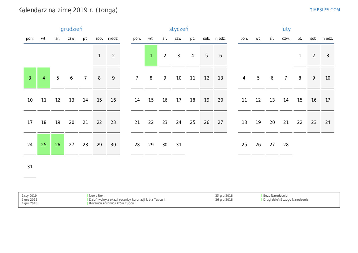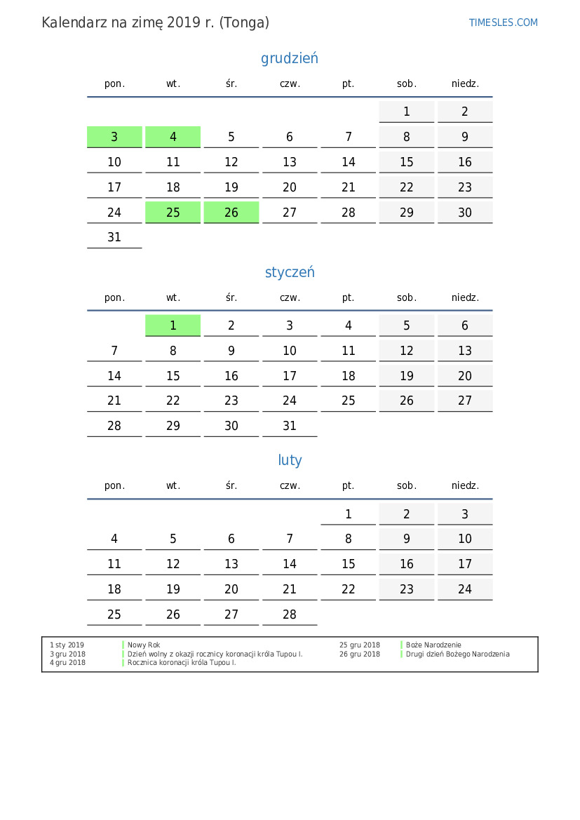 Pobierz i wydrukuj kalendarz PDF ze świętami i weekendami na zimę 2019 roku dla Tonga