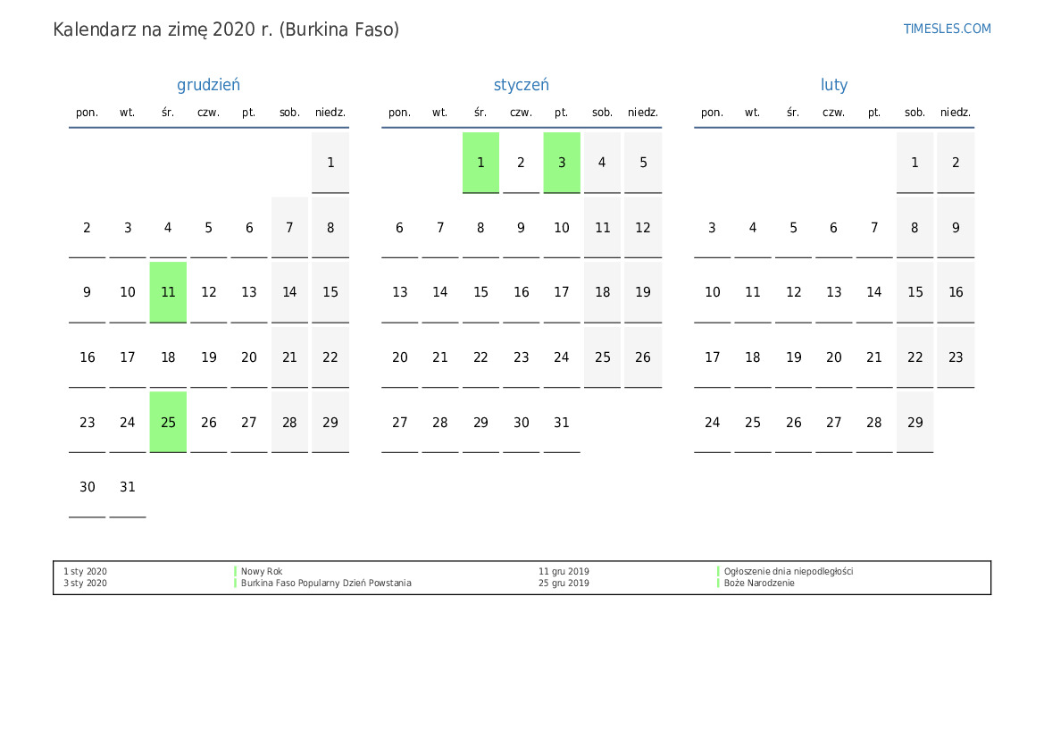 Kalendarz na zimę 2020 r. dla Burkina Faso