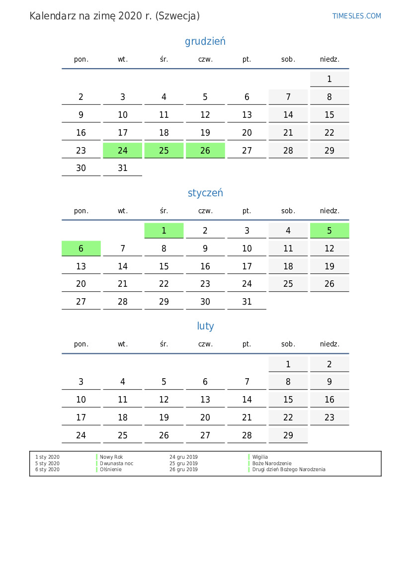Pobierz i wydrukuj kalendarz PDF ze świętami i weekendami na zimę 2020 roku dla Szwecji