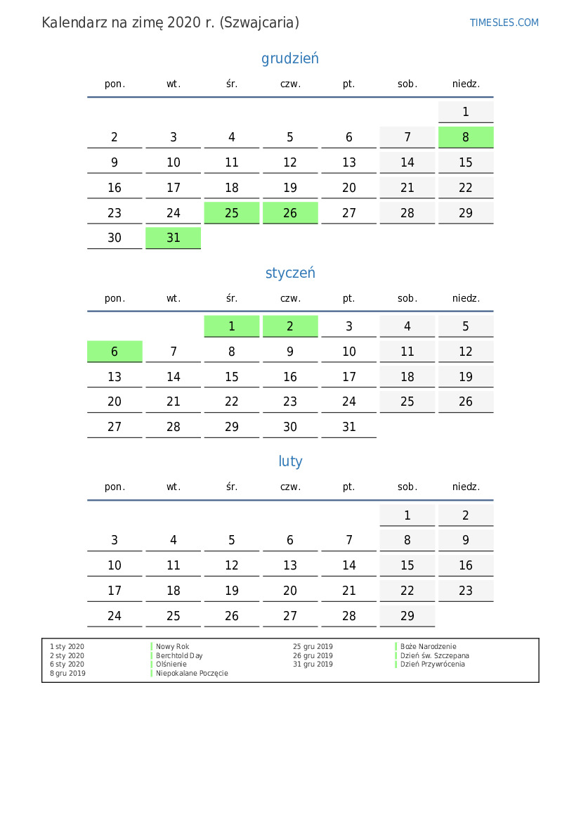 Pobierz i wydrukuj kalendarz PDF ze świętami i weekendami na zimę 2020 roku dla Szwajcarii