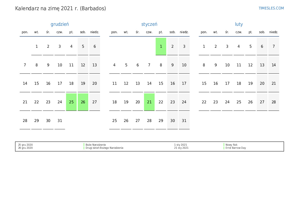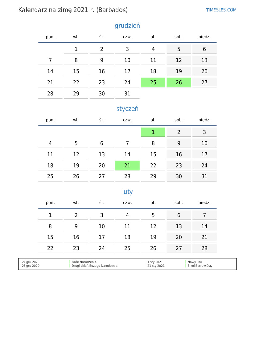 Pobierz i wydrukuj kalendarz PDF ze świętami i weekendami na zimę 2021 roku dla Barbadosu