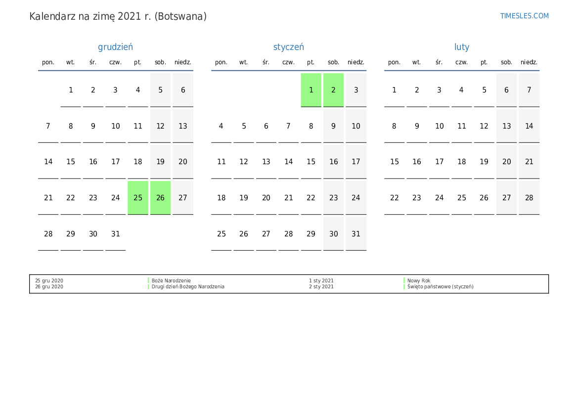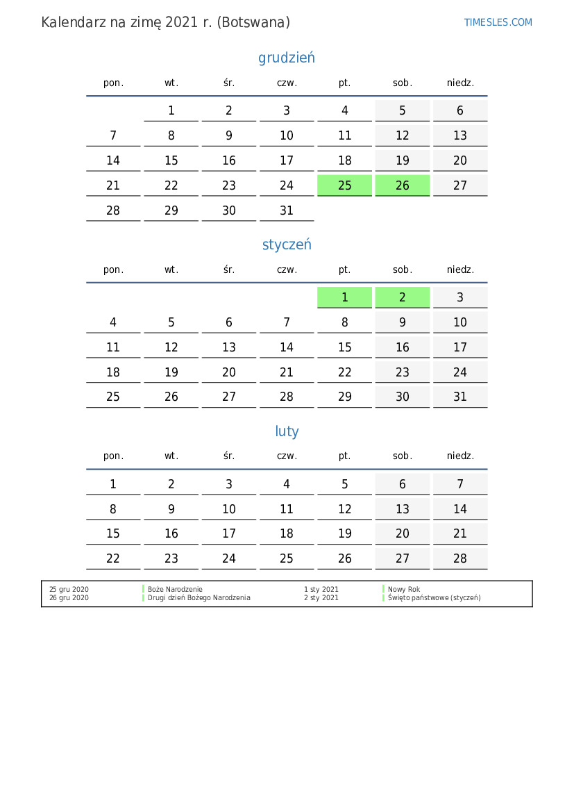 Pobierz i wydrukuj kalendarz PDF ze świętami i weekendami na zimę 2021 roku dla Botswany