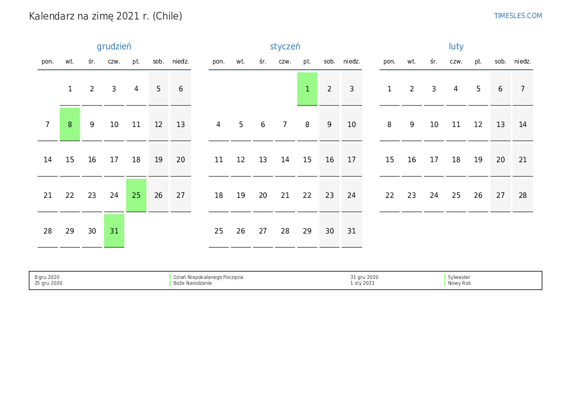 Pobierz i wydrukuj kalendarz PDF ze świętami i weekendami na zimę 2021 roku dla Chile