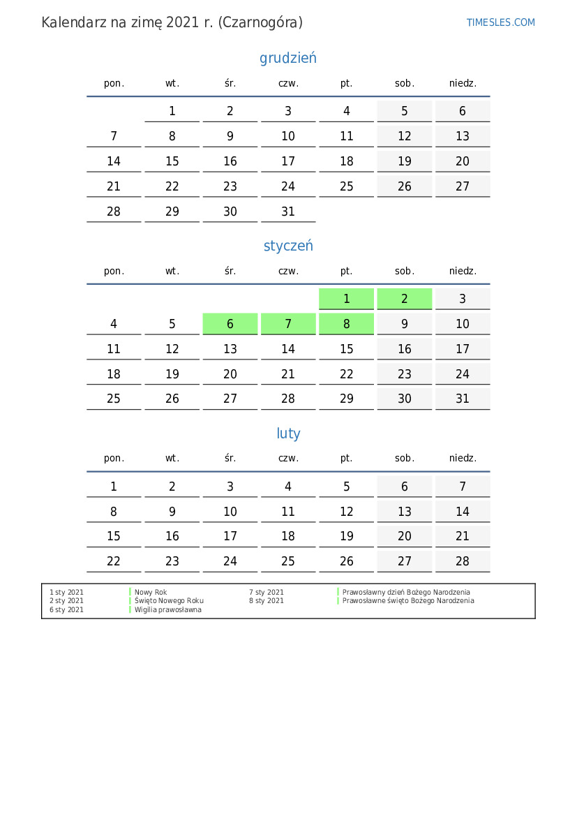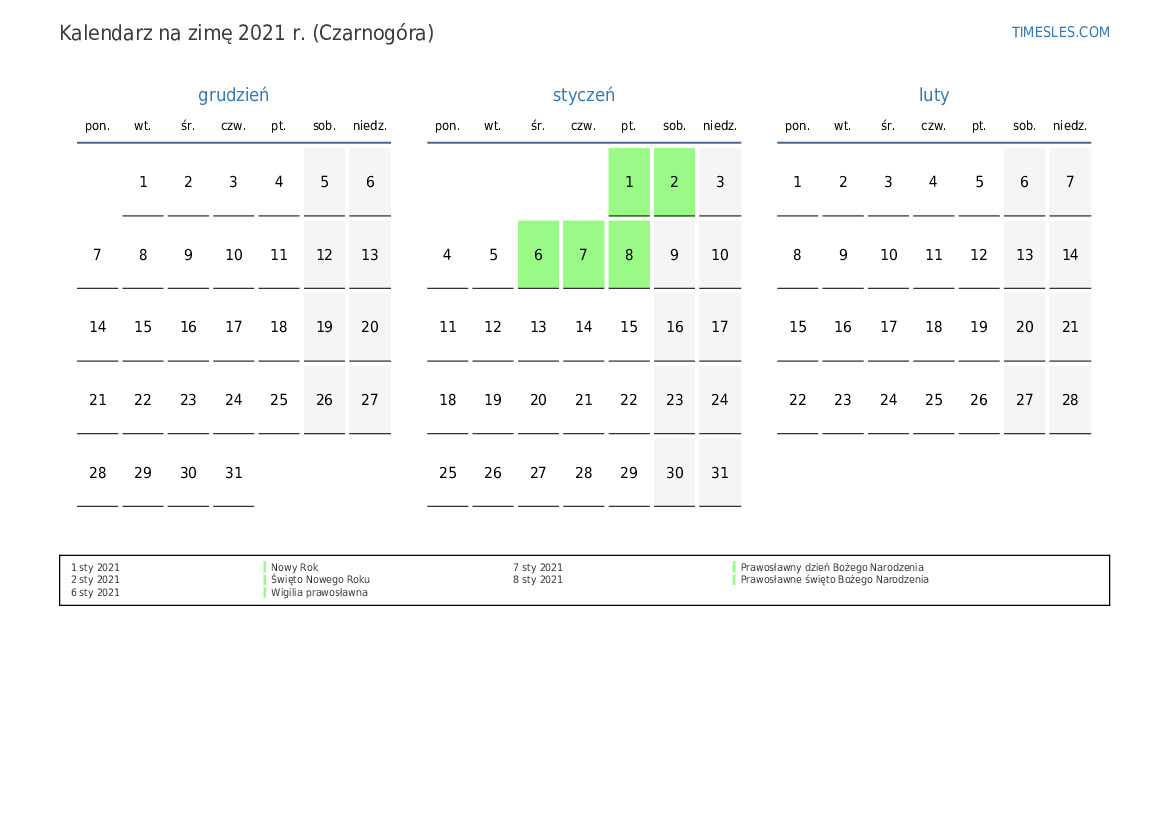 Pobierz i wydrukuj kalendarz PDF ze świętami i weekendami na zimę 2021 roku dla Czarnogóry