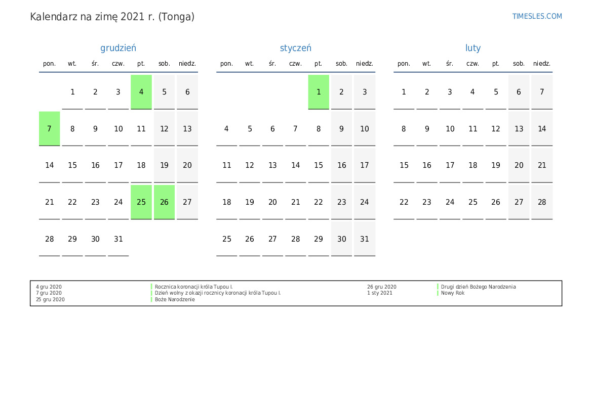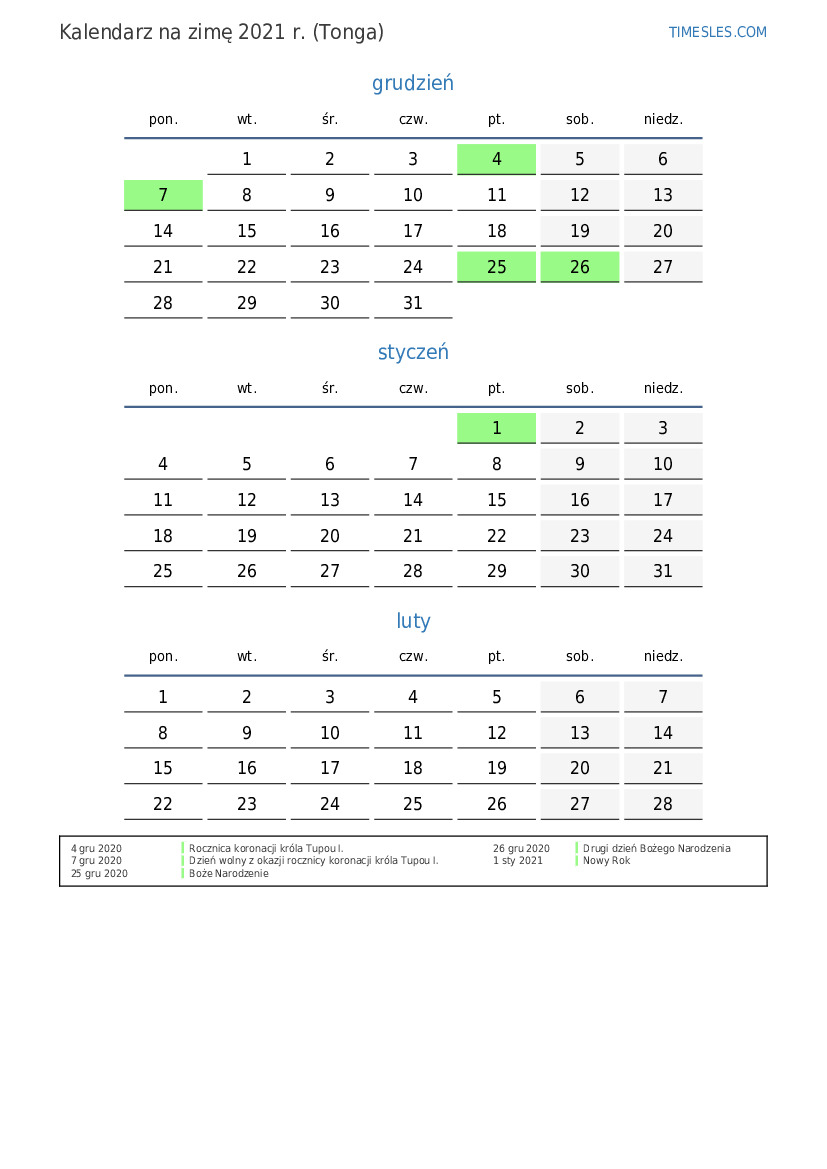 Pobierz i wydrukuj kalendarz PDF ze świętami i weekendami na zimę 2021 roku dla Tonga