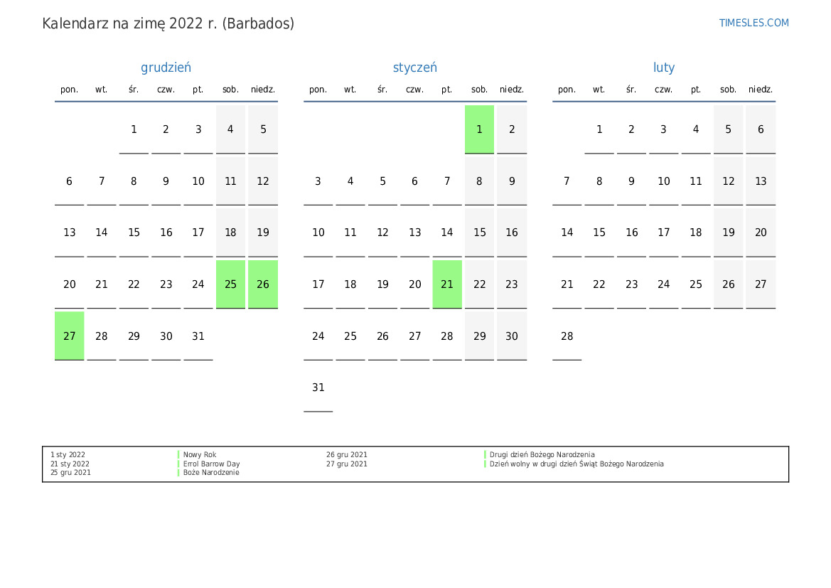 Kalendarz na zimę 2022 r. dla Barbadosu