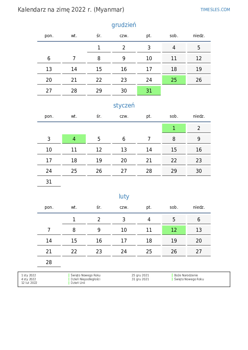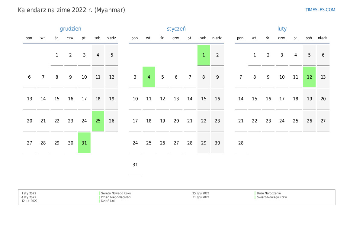 Kalendarz na zimę 2022 r. dla Myanmaru