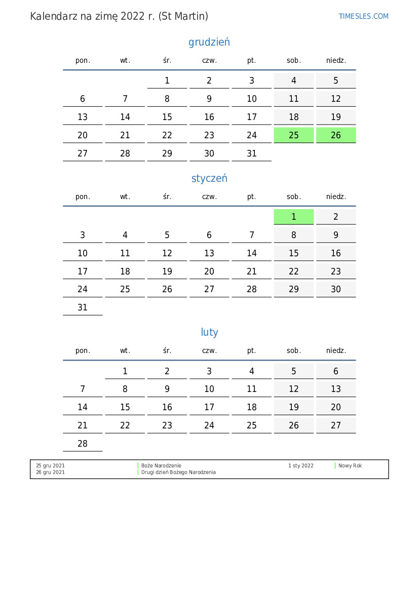 Pobierz i wydrukuj kalendarz PDF ze świętami i weekendami na zimę 2022 roku dla Sint Maarten