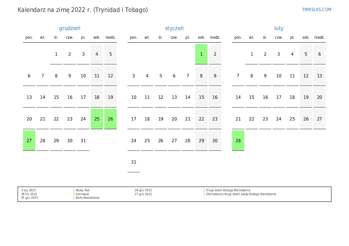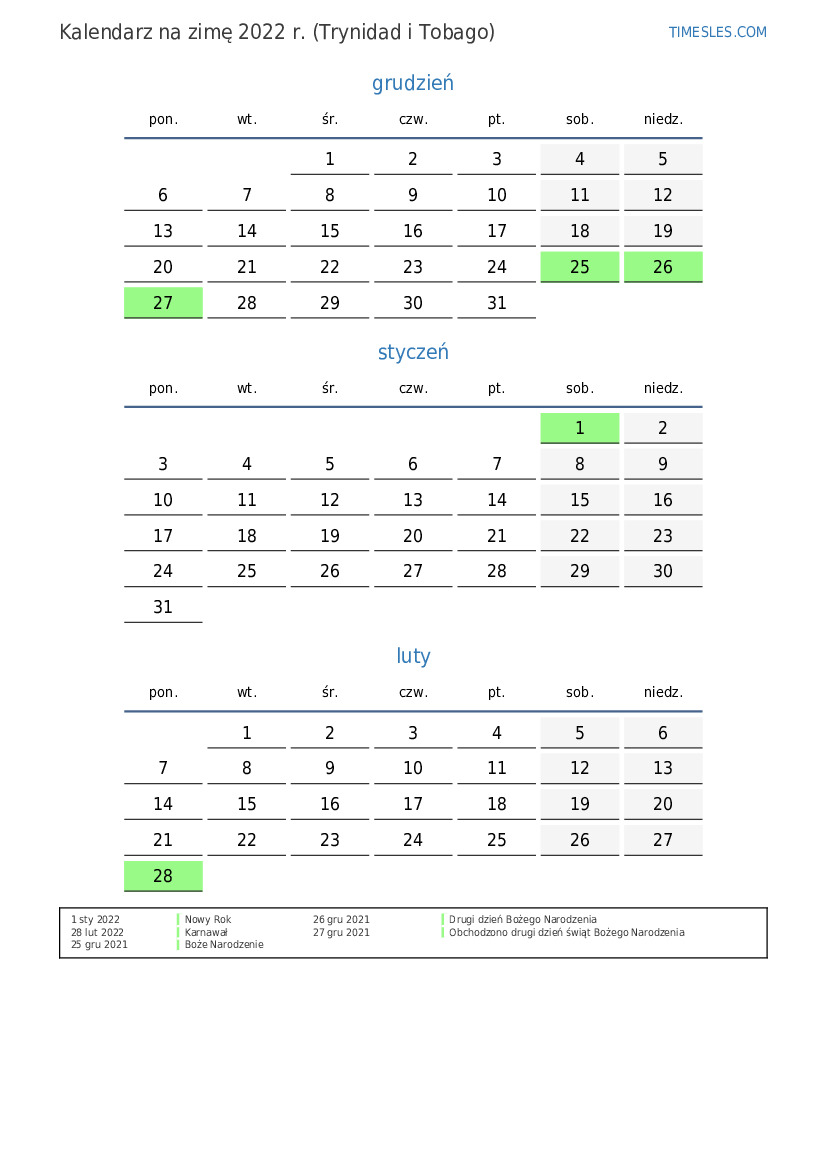 Kalendarz na zimę 2022 r. dla Trynidadu i Tobago