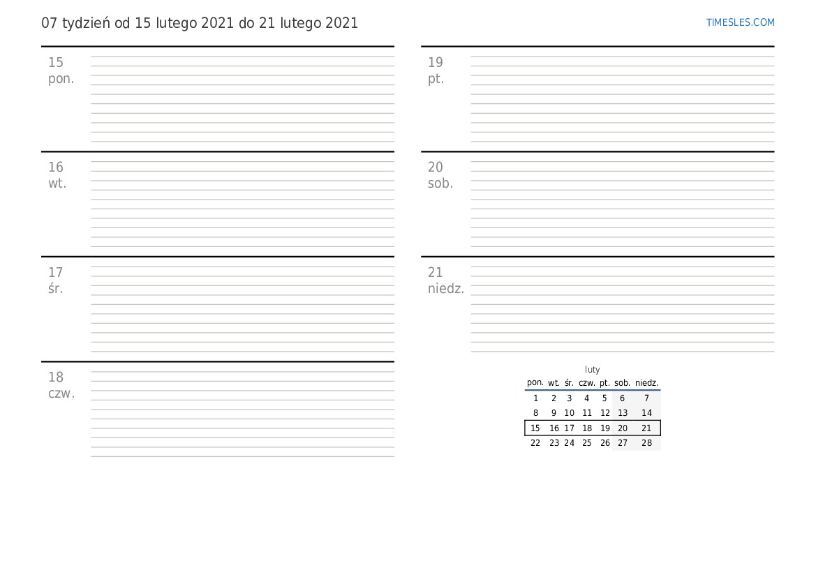 Pobierz i wydrukuj kalendarz w formacie PDF co tydzień na 07 tygodnie 2021 roku, od 15 lutego 2021 do 21 lutego 2021