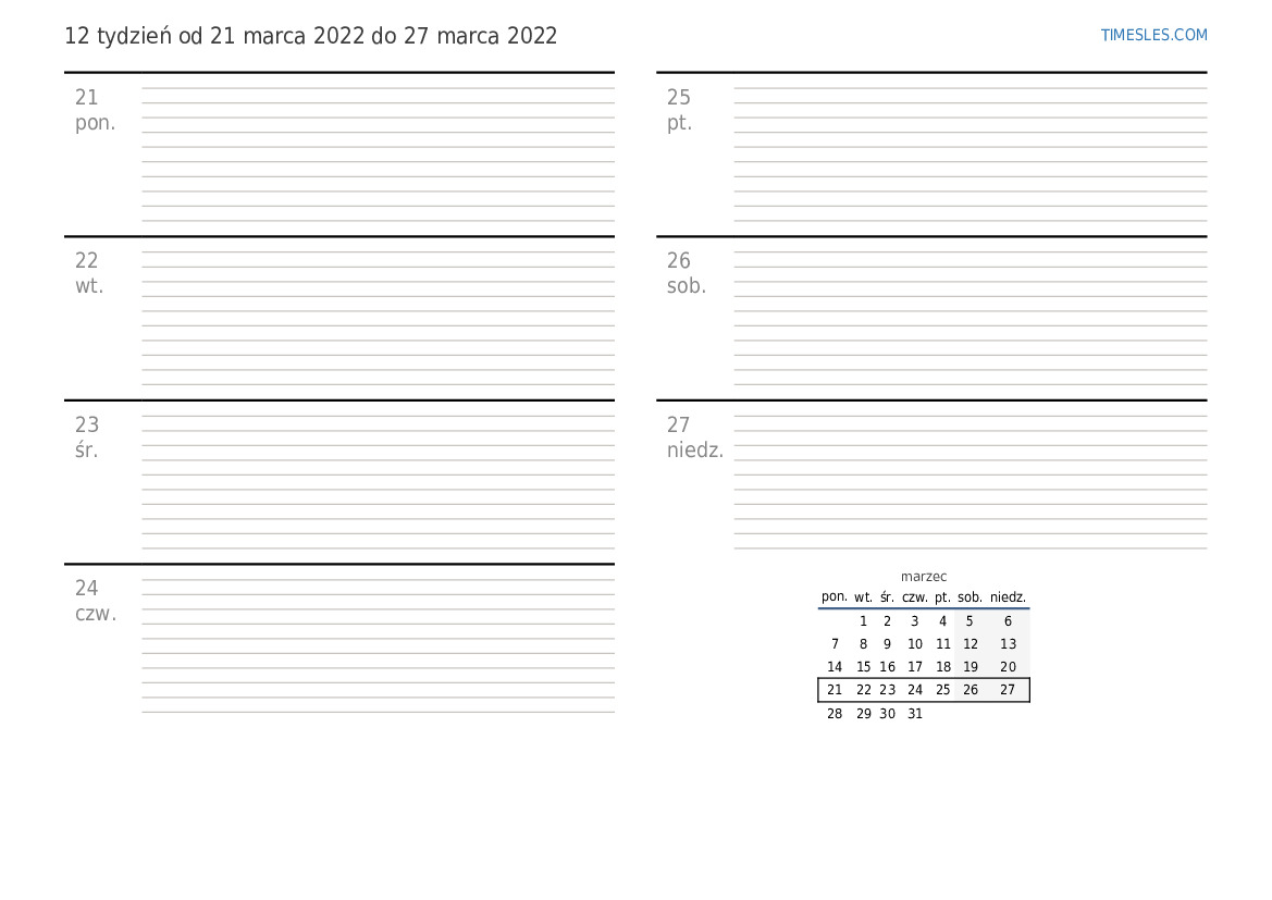 Pobierz i wydrukuj kalendarz w formacie PDF co tydzień na 12 tygodnie 2022 roku, od 21 marca 2022 do 27 marca 2022