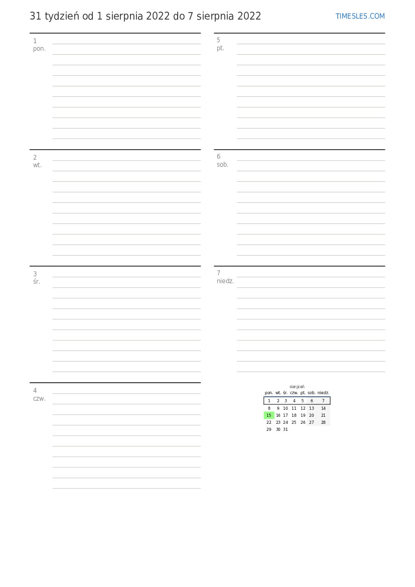 Pobierz i wydrukuj kalendarz w formacie PDF co tydzień na 31 tygodnie 2022 roku, od 1 sierpnia 2022 do 7 sierpnia 2022