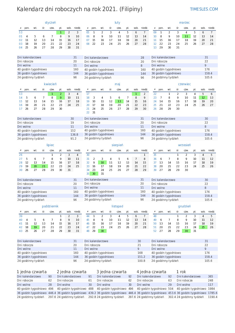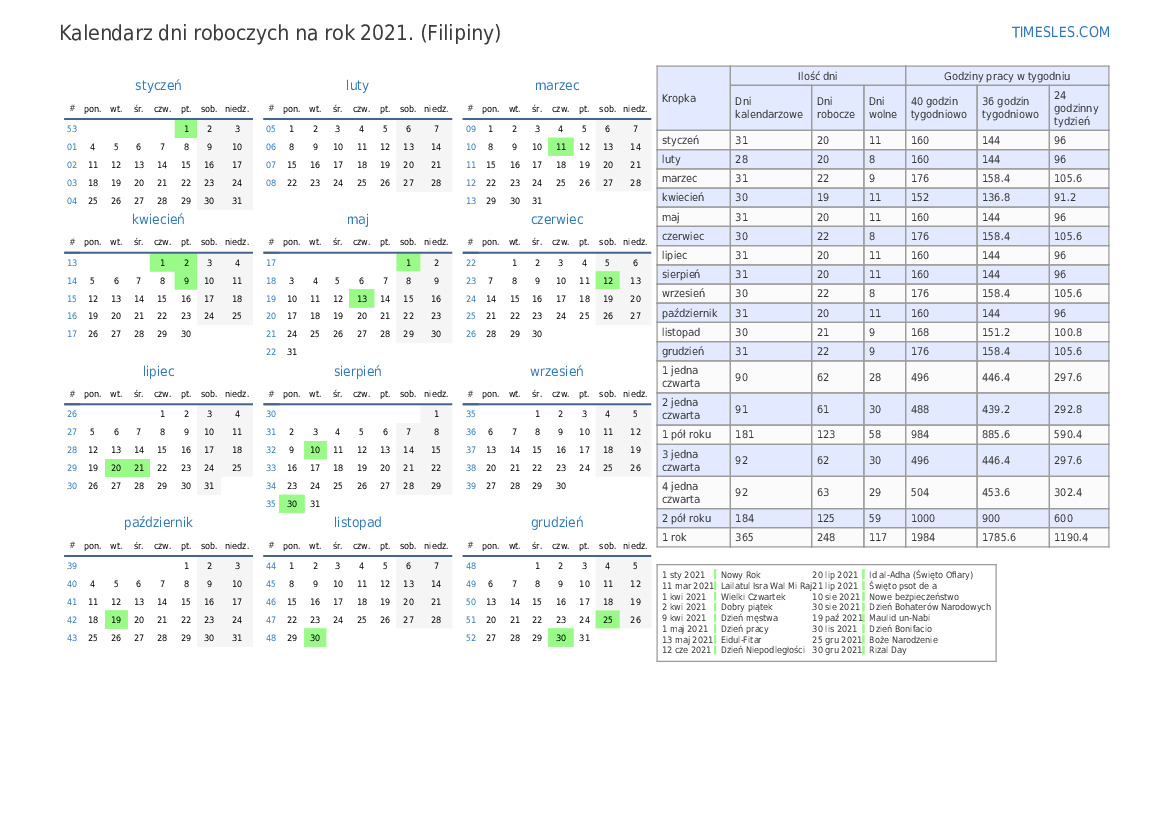 Kalendarz dni roboczych na marzec 2021 r. dla Filipin