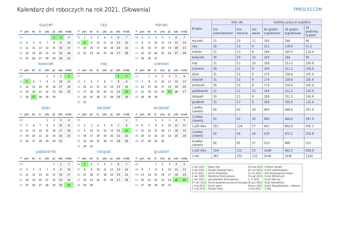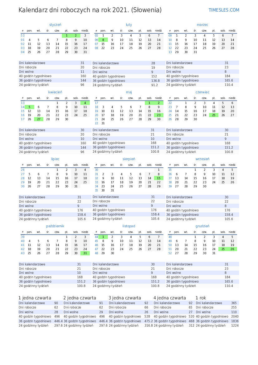 Dni robocze w sierpień 2021 r. w Słowenii są 2 świąt i dni wolnych w sierpień 2021 r.