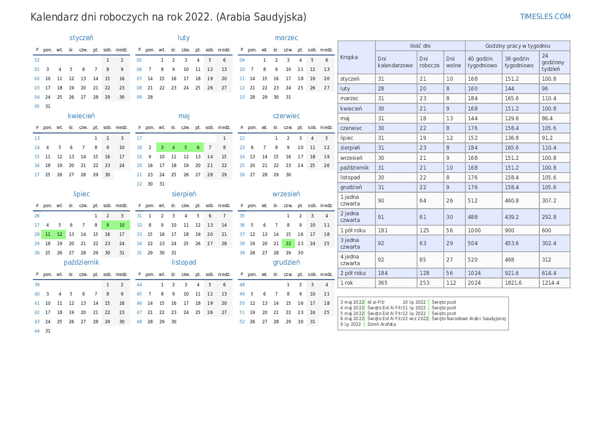 Dni robocze dla styczeń 2022 r. dla Arabii Saudyjskiej