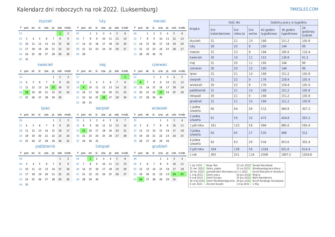 Pobierz i wydrukuj PDF kalendarz dni roboczych na marzec 2022 r. dla Luksemburga