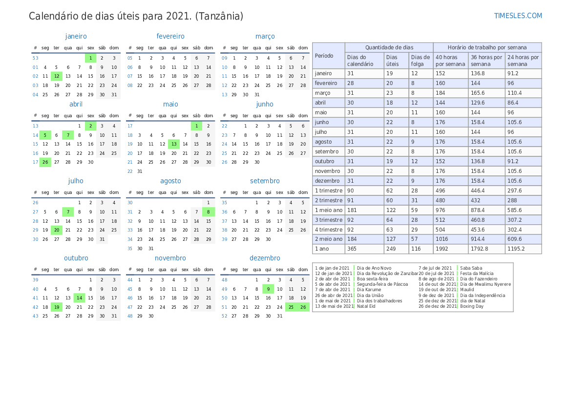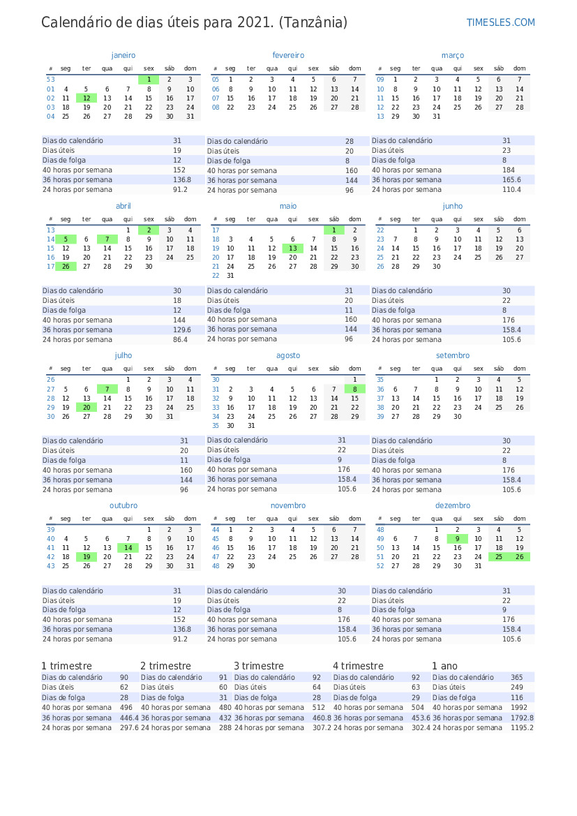 Baixe e imprima calendário de dias úteis em PDF com feriados e fins de semana para setembro de 2021 para a Tanzânia