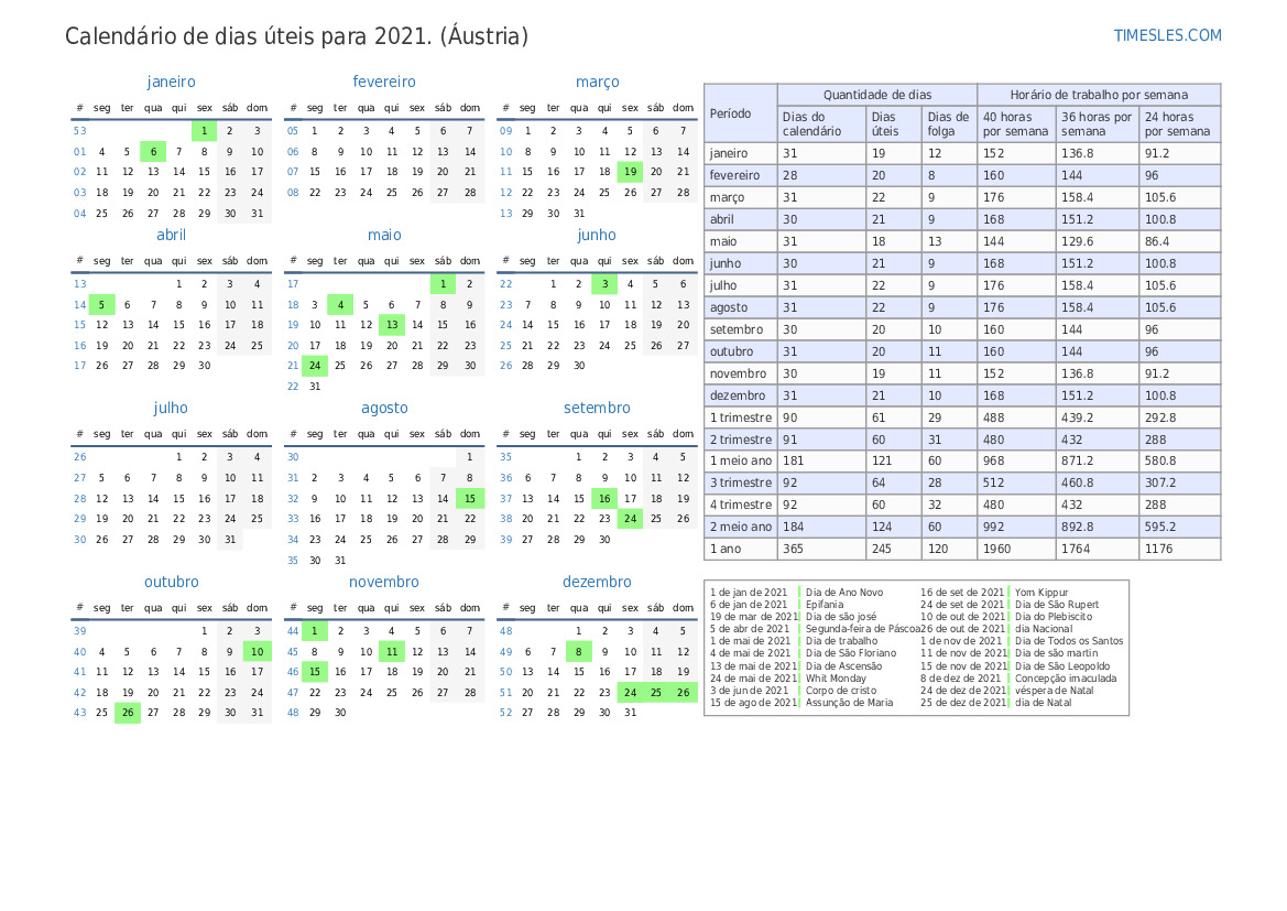 No 1 trimestre de 2021, haverá 6 feriados e dias de folga na Austria. O 1 trimestre de 2021 começa em na sexta e termina em na quarta-feira.