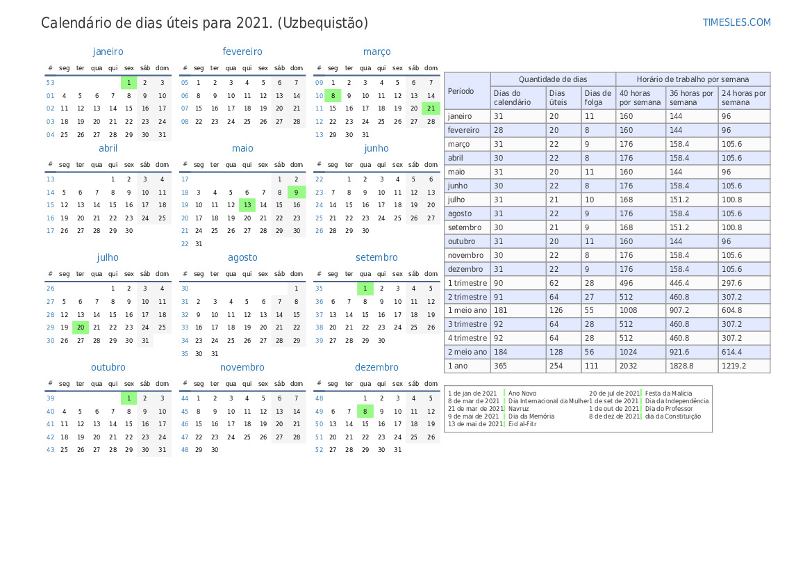 No 3 trimestre de 2021, haverá 3 feriados e dias de folga no Uzbequistão. O 3 trimestre de 2021 começa em na quinta feira e termina em na quinta feira.