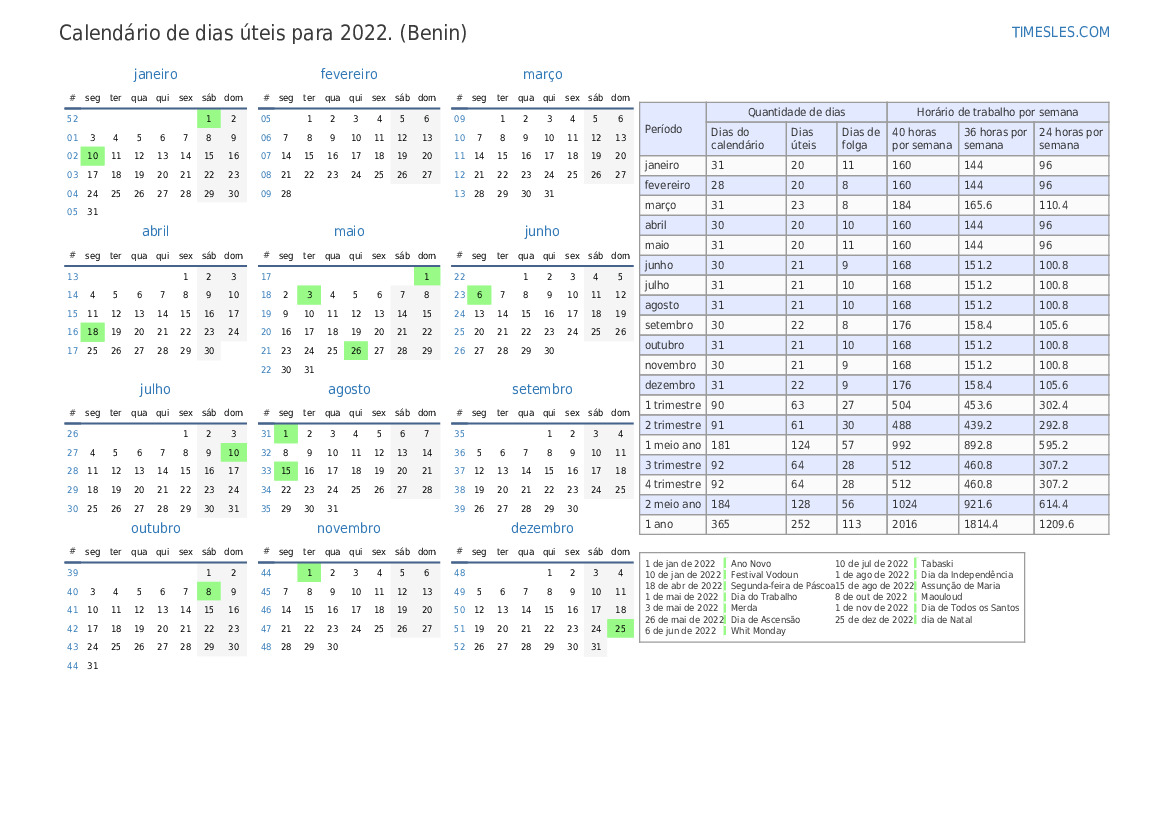 No 2 trimestre de 2022, haverá 8 feriados e dias de folga no Benin. O 2 trimestre de 2022 começa em na sexta e termina em na quinta feira.