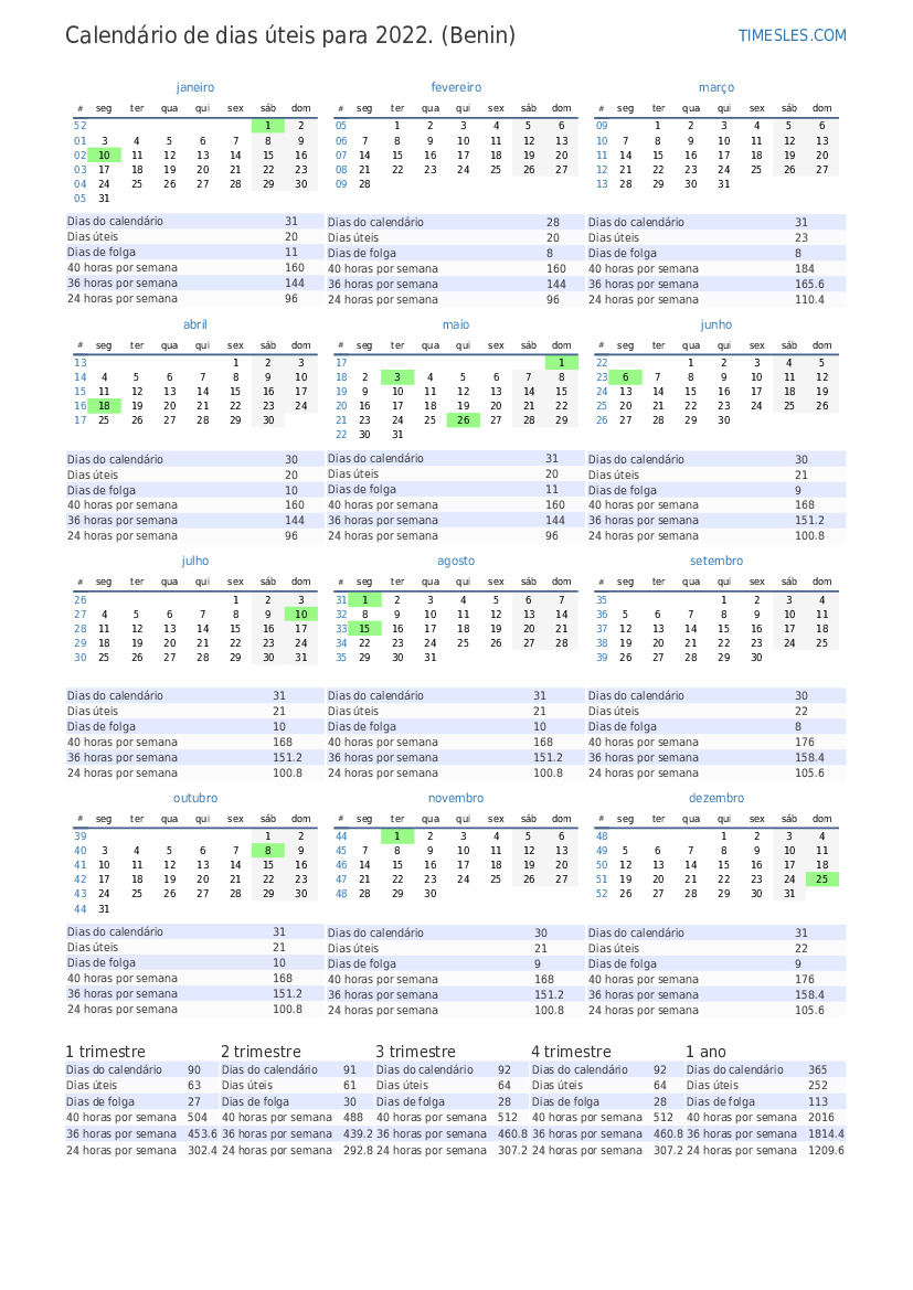 Calendário do 2 trimestre de 2022 para o Benin
