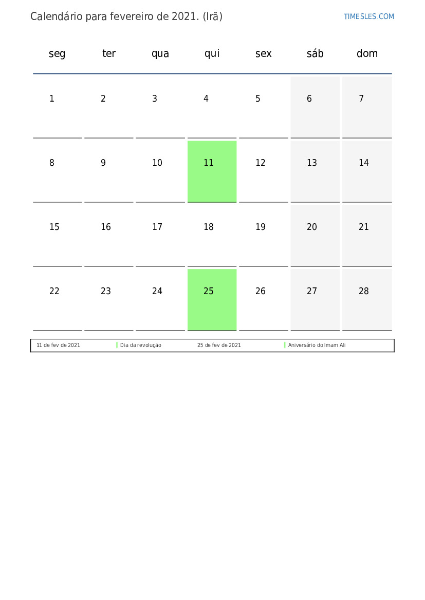 O mês de fevereiro contém 28 dias. Este é 2 mês de 2021. Estação do ano: inverno. O mês de fevereiro começa na segunda-feira e termina no domingo. No mês de fevereiro de 2021, há 2 feriados e dias de folga No Irã.