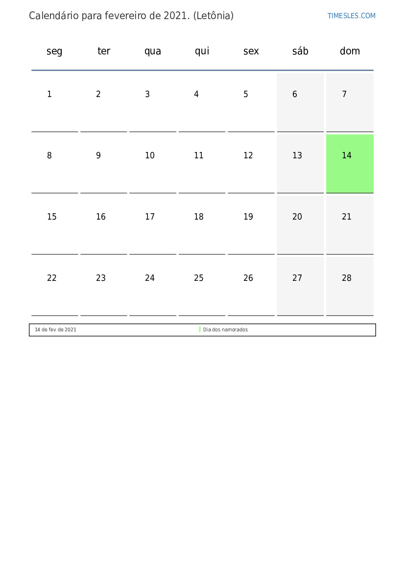 O mês de fevereiro contém 28 dias. Este é 2 mês de 2021. Estação do ano: inverno. O mês de fevereiro começa na segunda-feira e termina no domingo. No mês de fevereiro de 2021, há 1 feriado e dia de folga na Letônia.